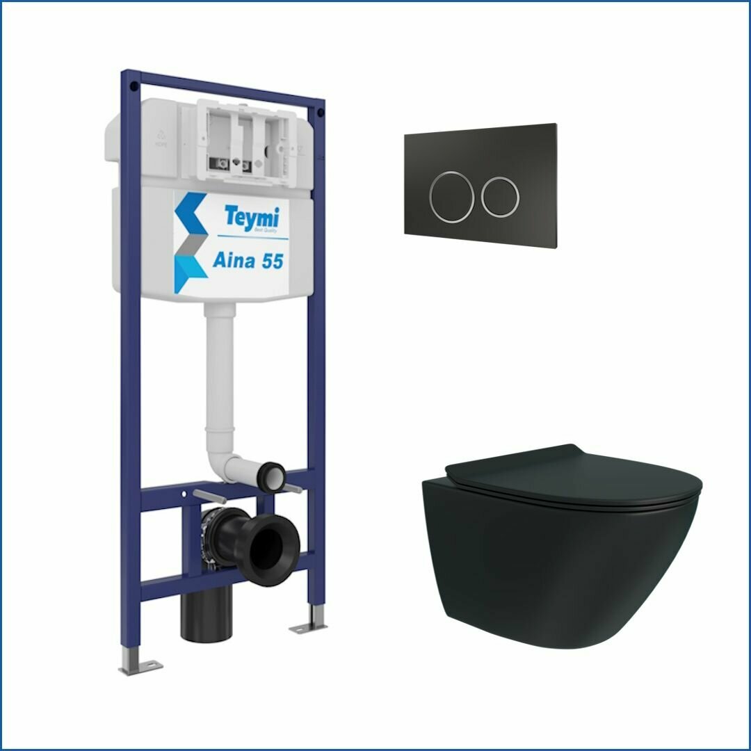 Инсталляция с унитазом комплект 5 в 1 Teymi унитаз подвесной безободковый торнадо черный Lina Pro Vortex Black кнопка черная F15010