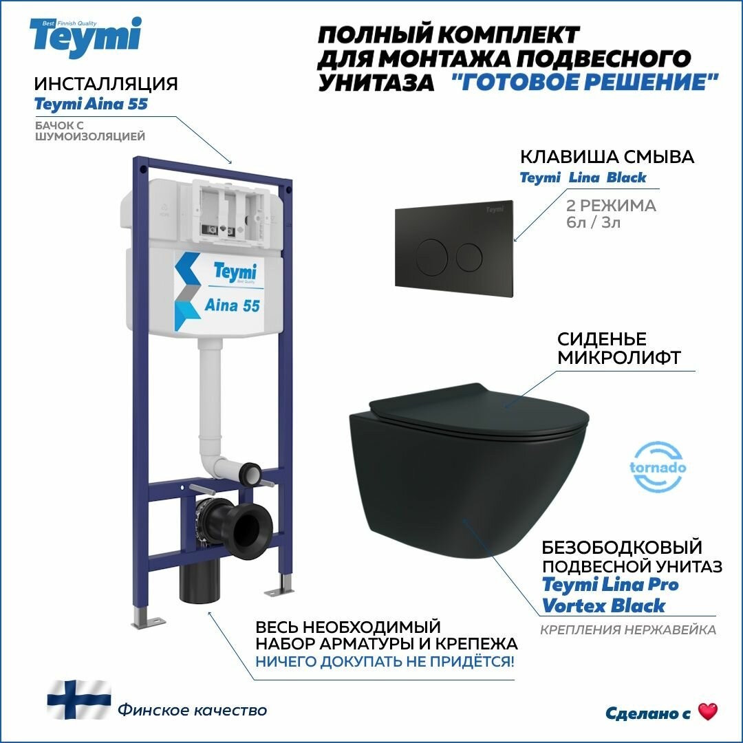 Инсталляция с унитазом комплект 5 в 1 Teymi унитаз подвесной безободковый торнадо черный Lina Pro Vortex Black кнопка черная F15004