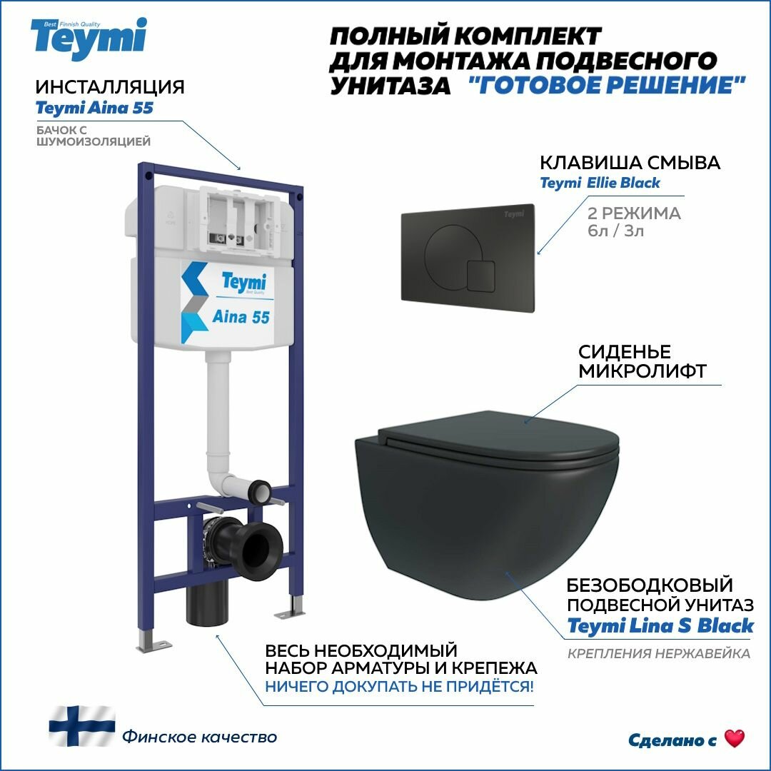 Инсталляция с унитазом комплект 5 в 1 Teymi унитаз подвесной безободковый черный Lina S Black кнопка нержавеющая сталь F13902