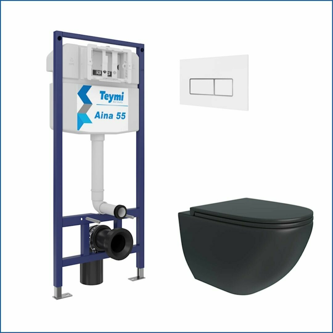 Инсталляция с унитазом комплект 5 в 1 Teymi унитаз подвесной безободковый черный Lina S Black кнопка белая F13895