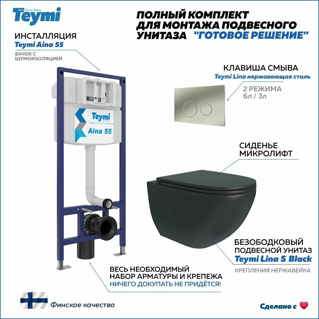 СохранитьИнсталляция с унитазом комплект 5 в 1 Teymi унитаз подвесной безободковый черный Lina S Black кнопка нержавеющая сталь F13902 интересное:
