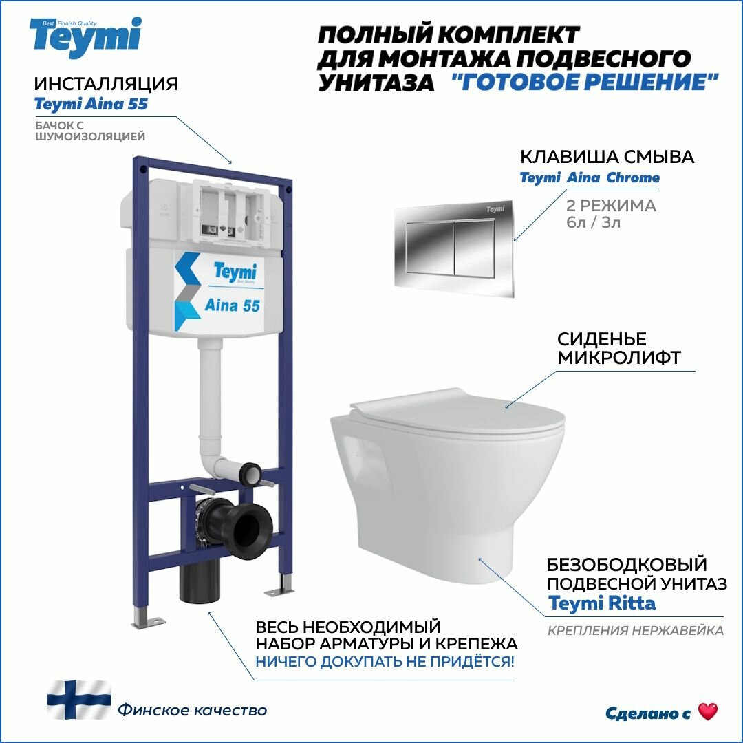 Инсталляция с унитазом комплект 5 в 1 Teymi унитаз подвесной безободковый Ritta кнопка белая F13854