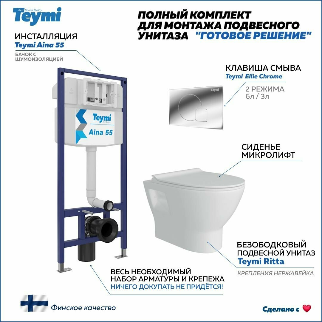 Инсталляция с унитазом комплект 5 в 1 Teymi унитаз подвесной безободковый Ritta кнопка белая / хром F13857
