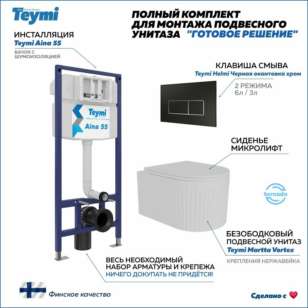 Инсталляция с унитазом комплект 5 в 1 Teymi унитаз подвесной безободковый торнадо Martta Vortex кнопка нержавеющая сталь F14567