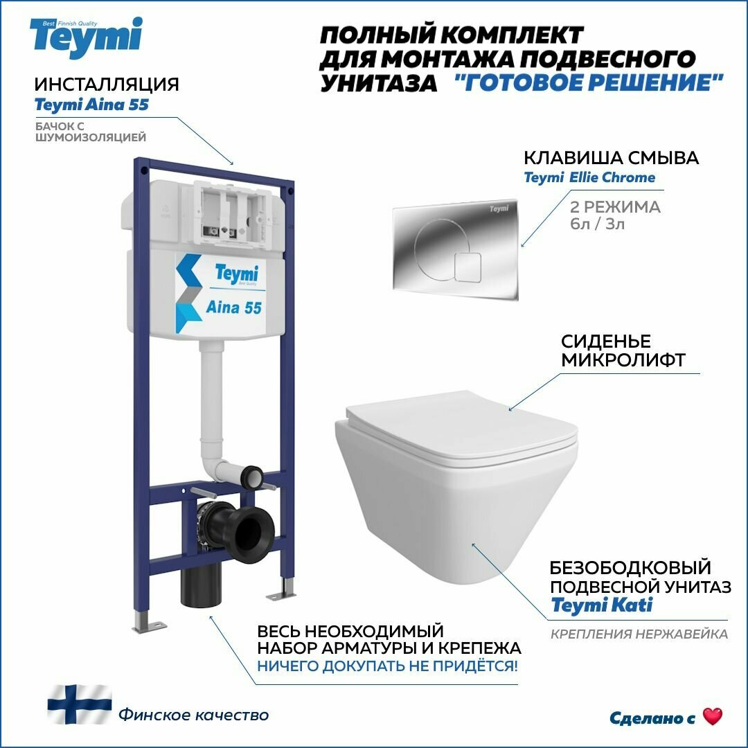 Инсталляция с унитазом комплект 5 в 1 Teymi унитаз подвесной безободковый Kati кнопка хром F13690