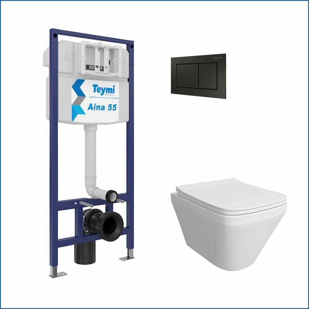 Инсталляция с унитазом комплект 5 в 1 Teymi унитаз подвесной безободковый Kati кнопка черная F13689