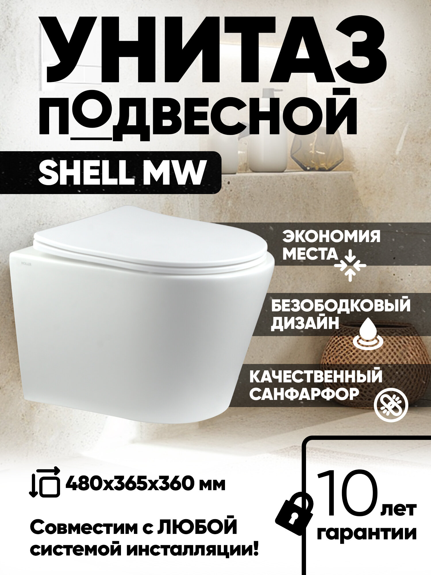 Унитаз подвесной безободковый SHELL MW (480*365*360мм, сиденье дюропласт, микролифт) белый матовый интересное: