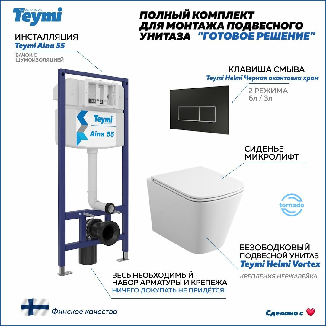 Инсталляция с унитазом комплект 5 в 1 Teymi унитаз подвесной безободковый торнадо Helmi Vortex кнопка черная / хром F13617