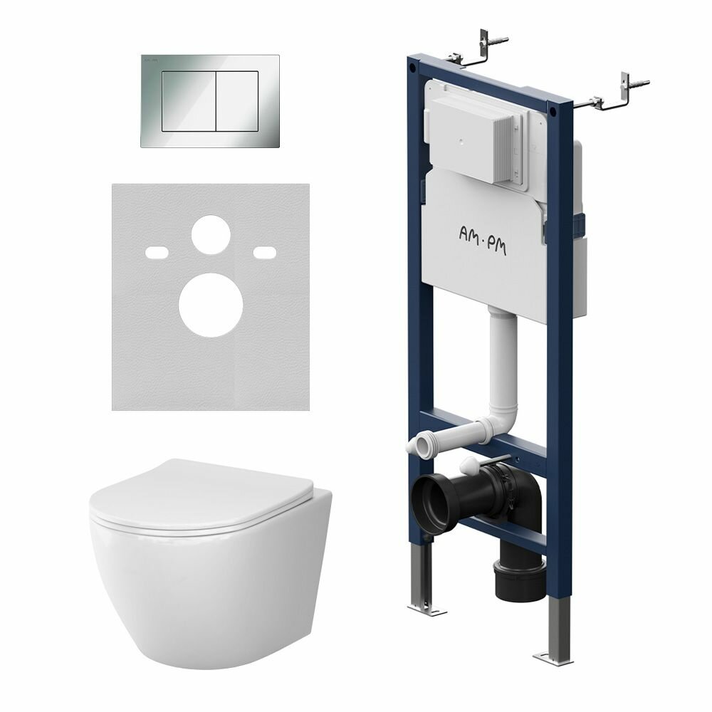 Инсталляция с унитазом комплект AM.PM Like Aquaspin, безободковый, кнопка Pro S глянцевый хром, шумоизоляция