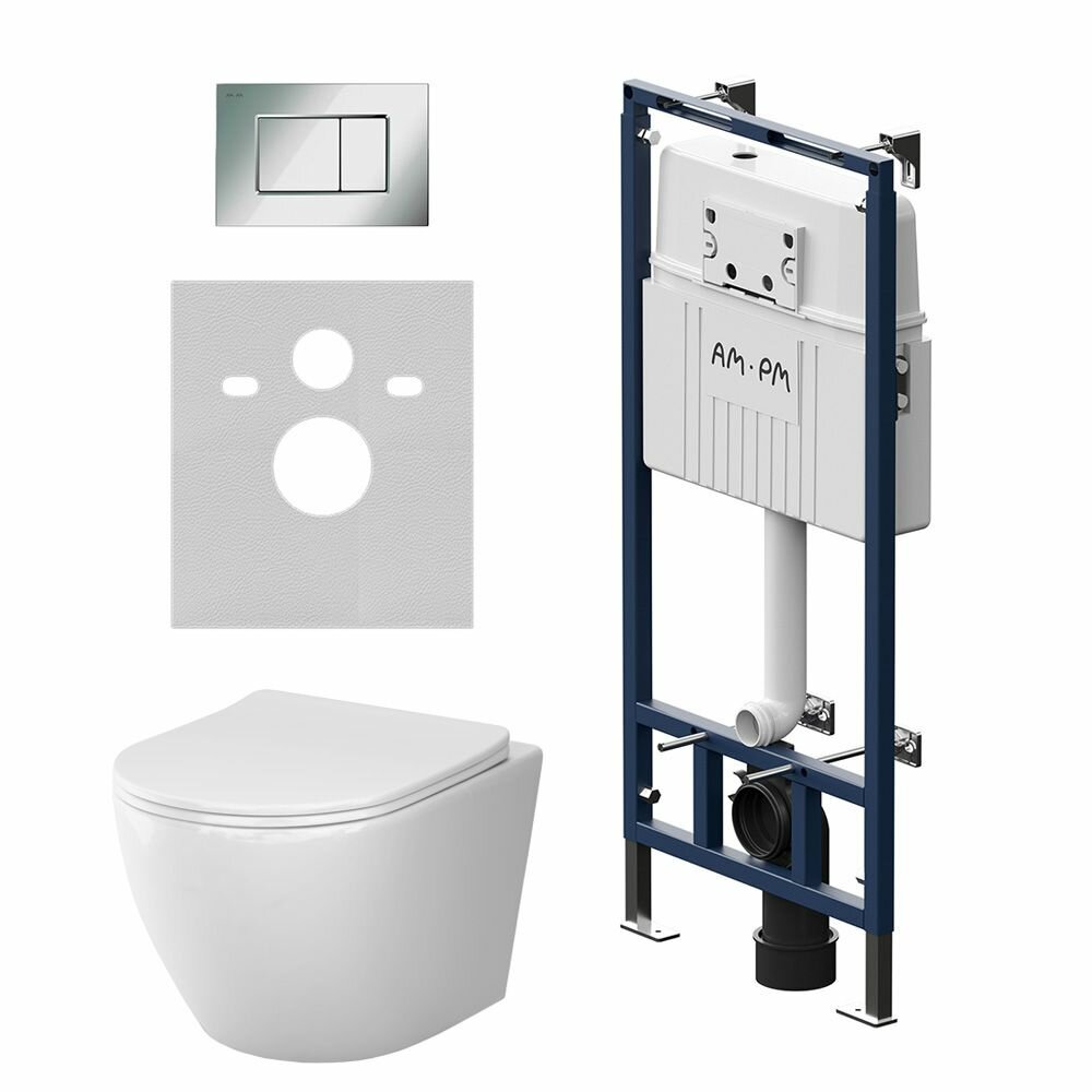 Инсталляция с унитазом комплект AM.PM Like Aquaspin, безободковый, кнопка Pro S глянцевый хром, шумоизоляция