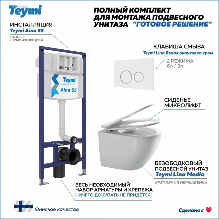 СохранитьИнсталляция с унитазом комплект 5 в 1 Teymi унитаз подвесной безободковый Lina Media кнопка белая / хром F13684 интересное: