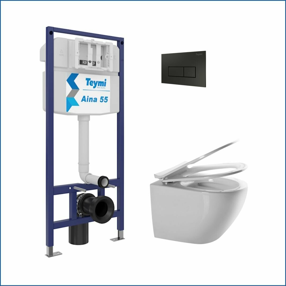 Инсталляция с унитазом комплект 5 в 1 Teymi унитаз подвесной безободковый Lina Media кнопка черная F13667