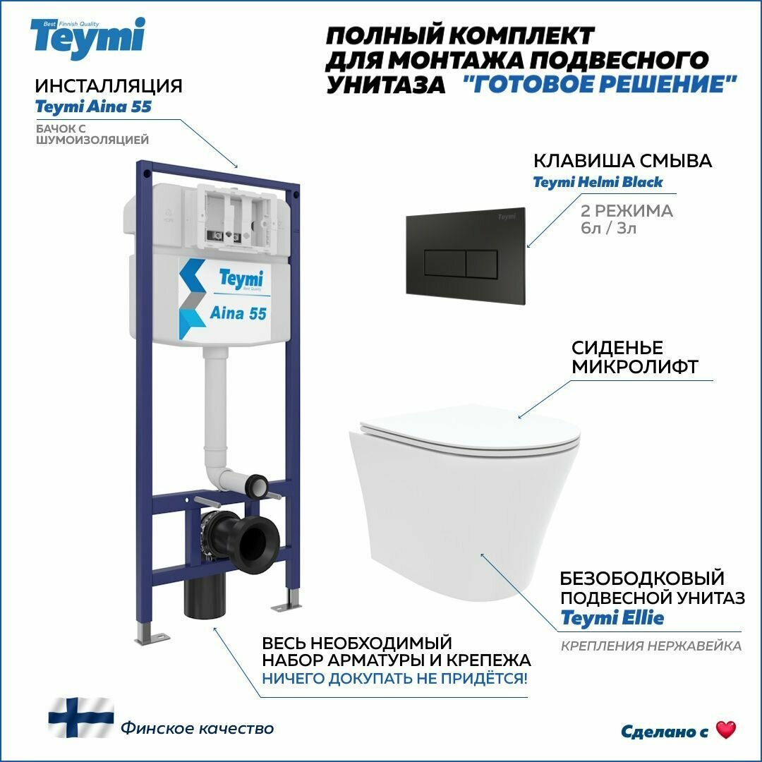 Инсталляция с унитазом комплект 5 в 1 Teymi унитаз подвесной безободковый Ellie кнопка черная F13647