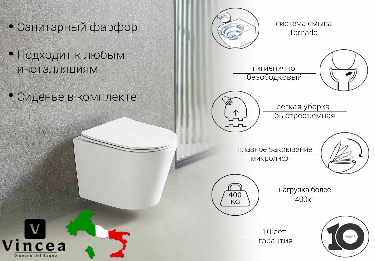 Унитаз подвесной Vincea piatti vt1-11t tornado, цвет белый, ультратонкое soft-close сиденье интересное: