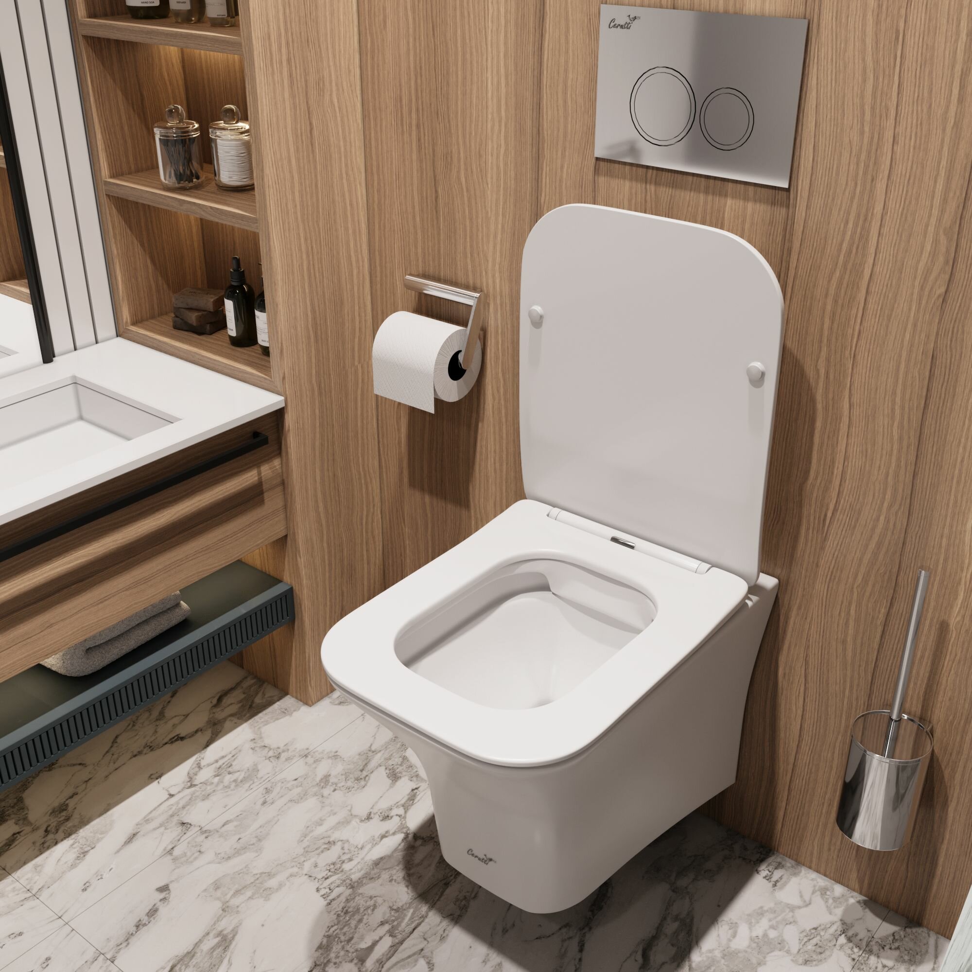 Подвесной унитаз Ceruttispa SELLA Aria Tornado MMW (490х370х370) торнадо, безободковый, микролифт, мрамор белый матовый