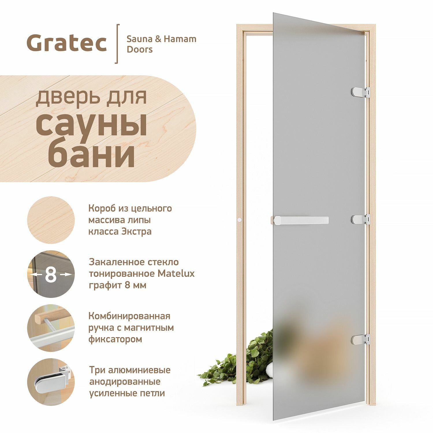 Дверь для бани и сауны Gratec Kati, короб из массива липы, серое матовое закаленное стекло 8 мм, правое открывание интересное: