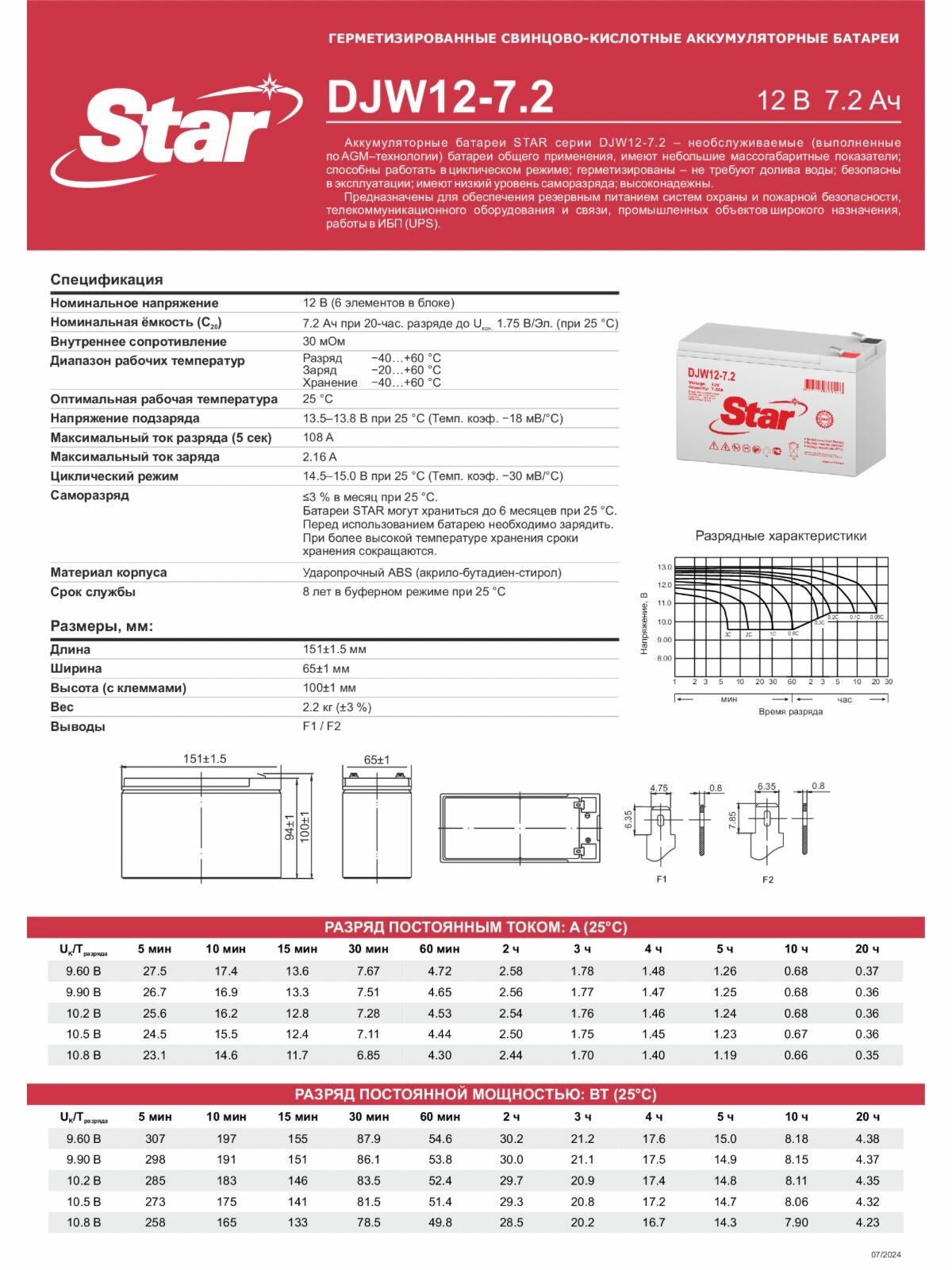 Аккумулятор DJW12-12 F2 STAR (12В 12Ач) для скутеров, ИБП, сигнализаций, GPS оборудования, телекоммуникации, эхолотов