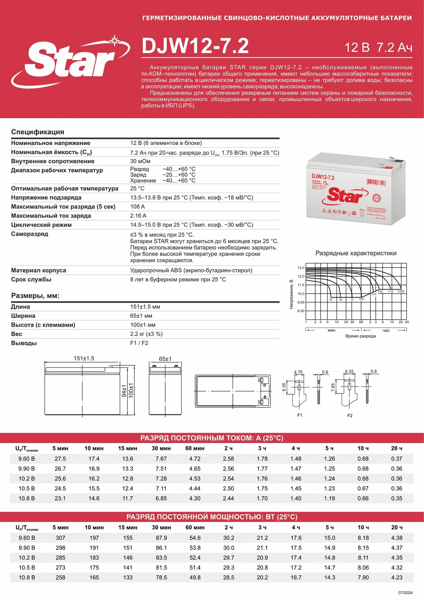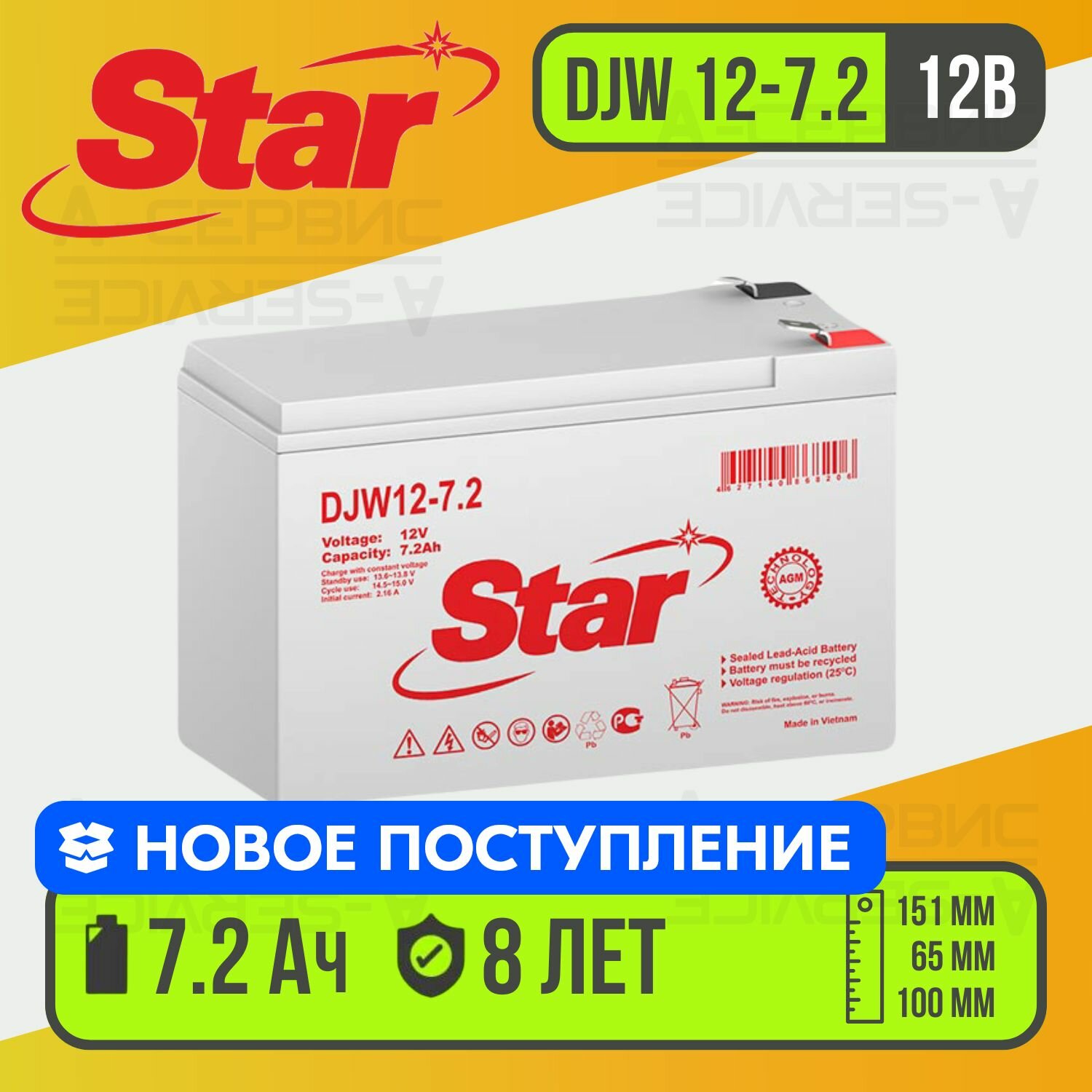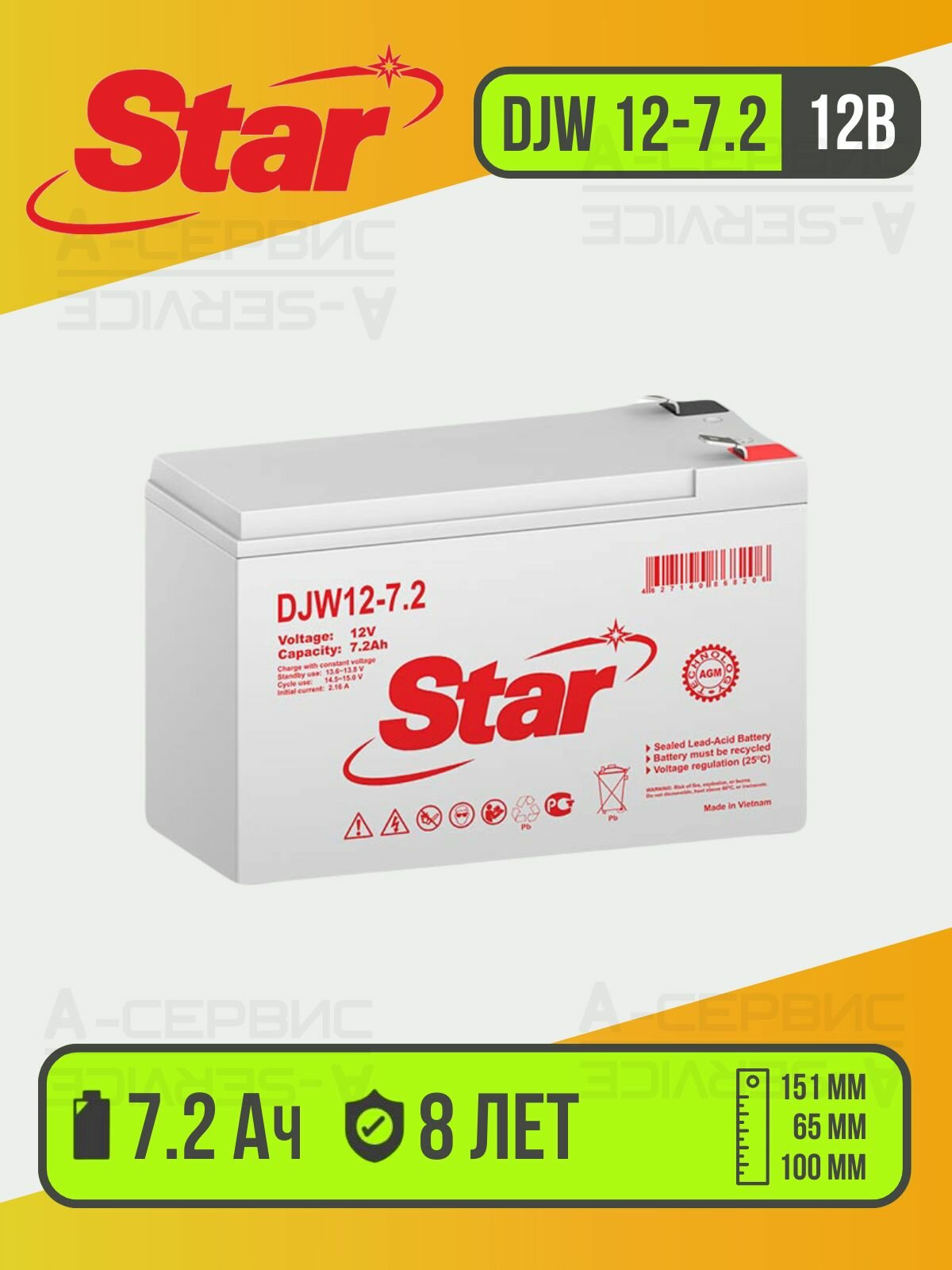 Купить Аккумулятор DJW12-7.2 STAR (12В 7.2Ач) для скутеров, ИБП, сигнализаций, GPS оборудования, телекоммуникации, эхолотов