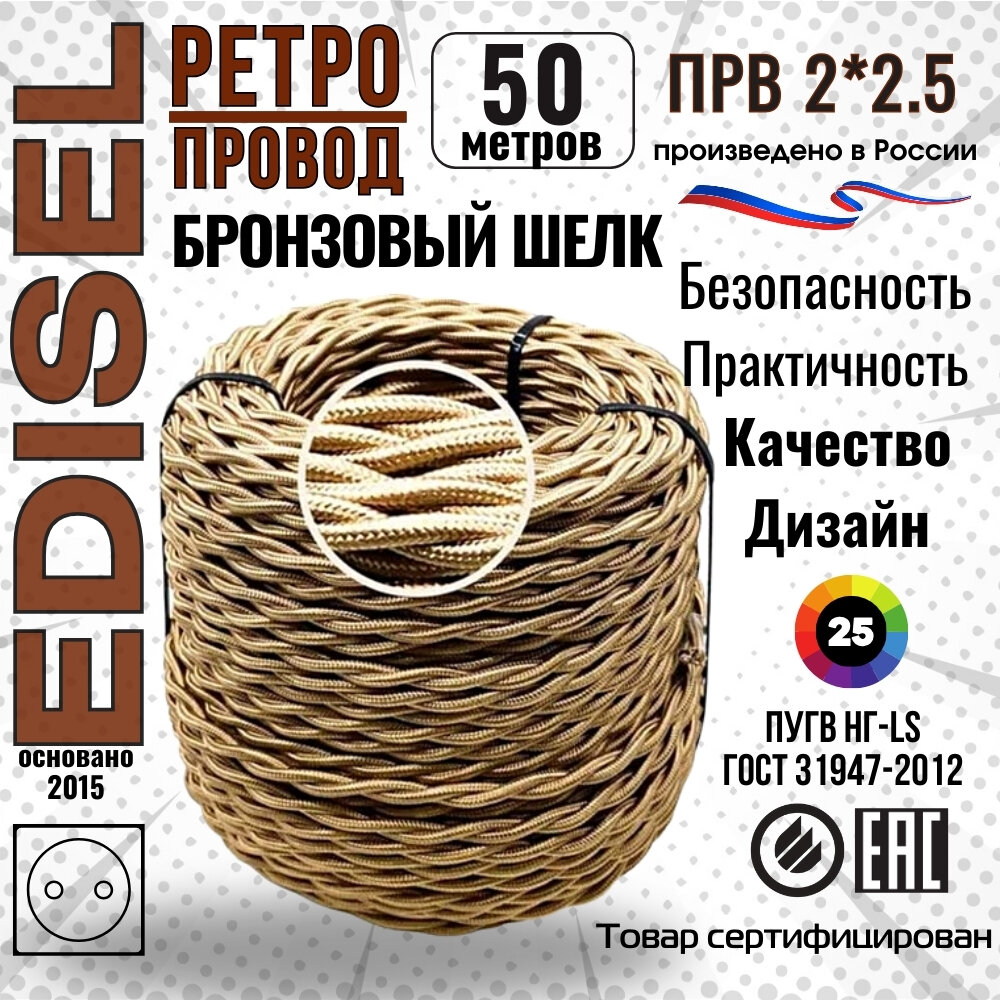 Купить Ретро проводка, витой провод, EDISEL ПРВ 2х2,5 ГОСТ, Бронзовый шелк, 50 м