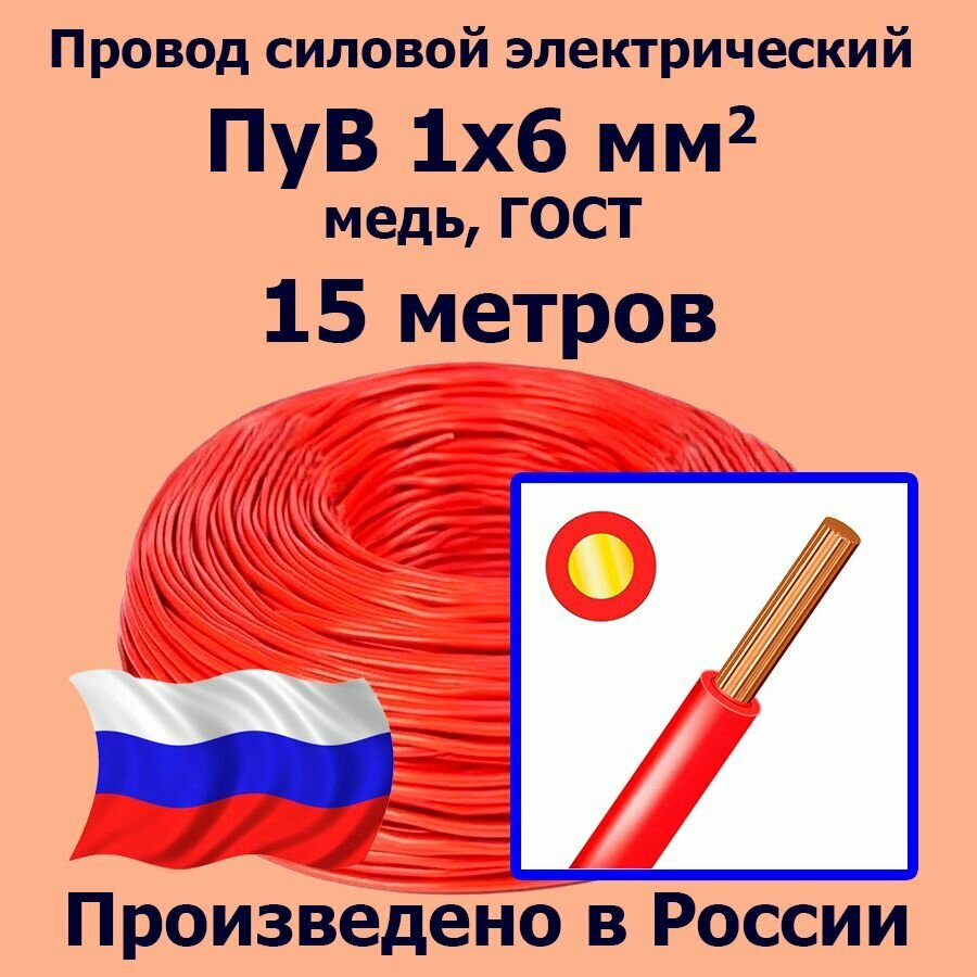 Купить Провод силовой электрический ПуВ 1х6 мм2, красный, медь, ГОСТ, 15 метров