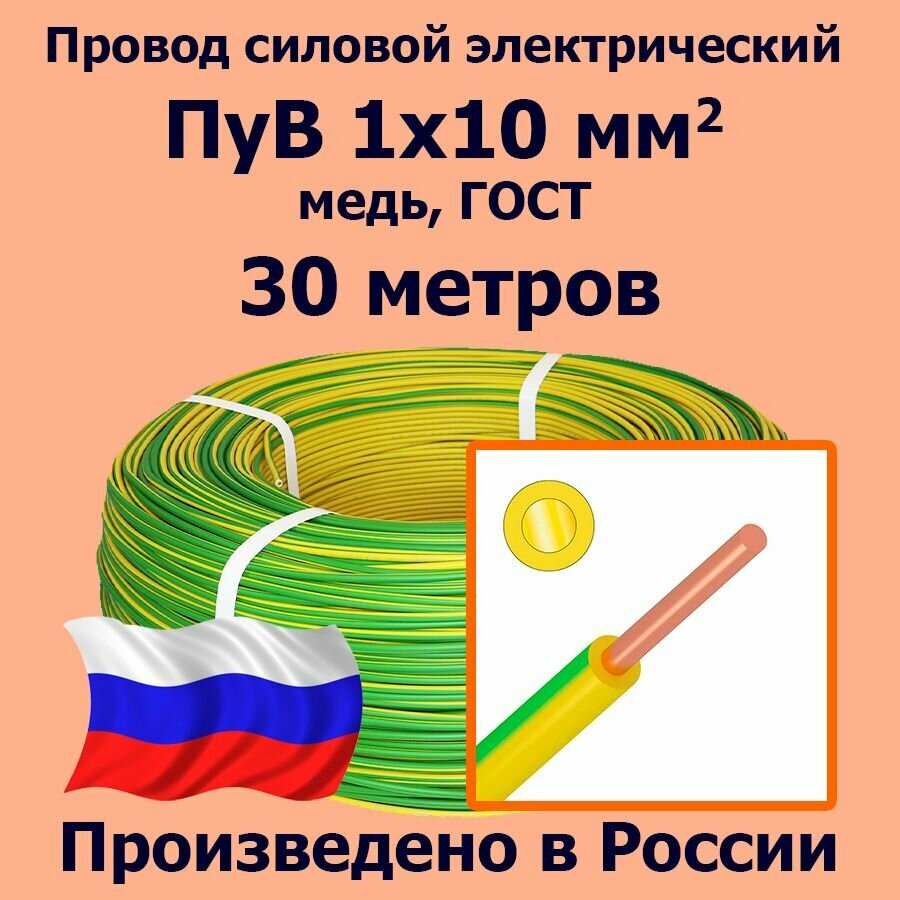 Купить Провод силовой электрический ПуВ 1х10 мм2, желто-зеленый, медь, ГОСТ, 30 метров