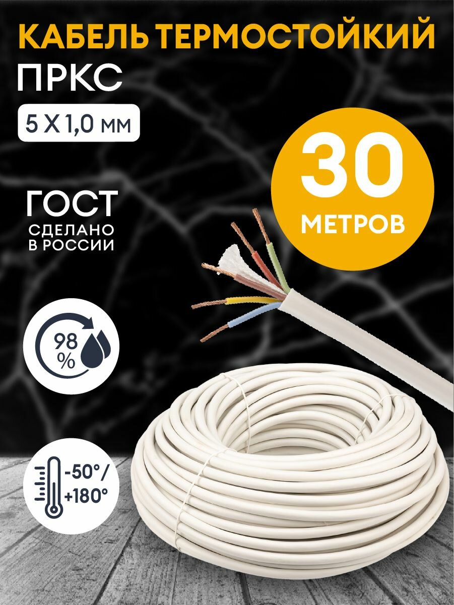 Провод термостойкий пркс 5х0.75 мм2 / 30 метров / Кабель силовой электрический соединительный для бань, саун, каминов, печей.