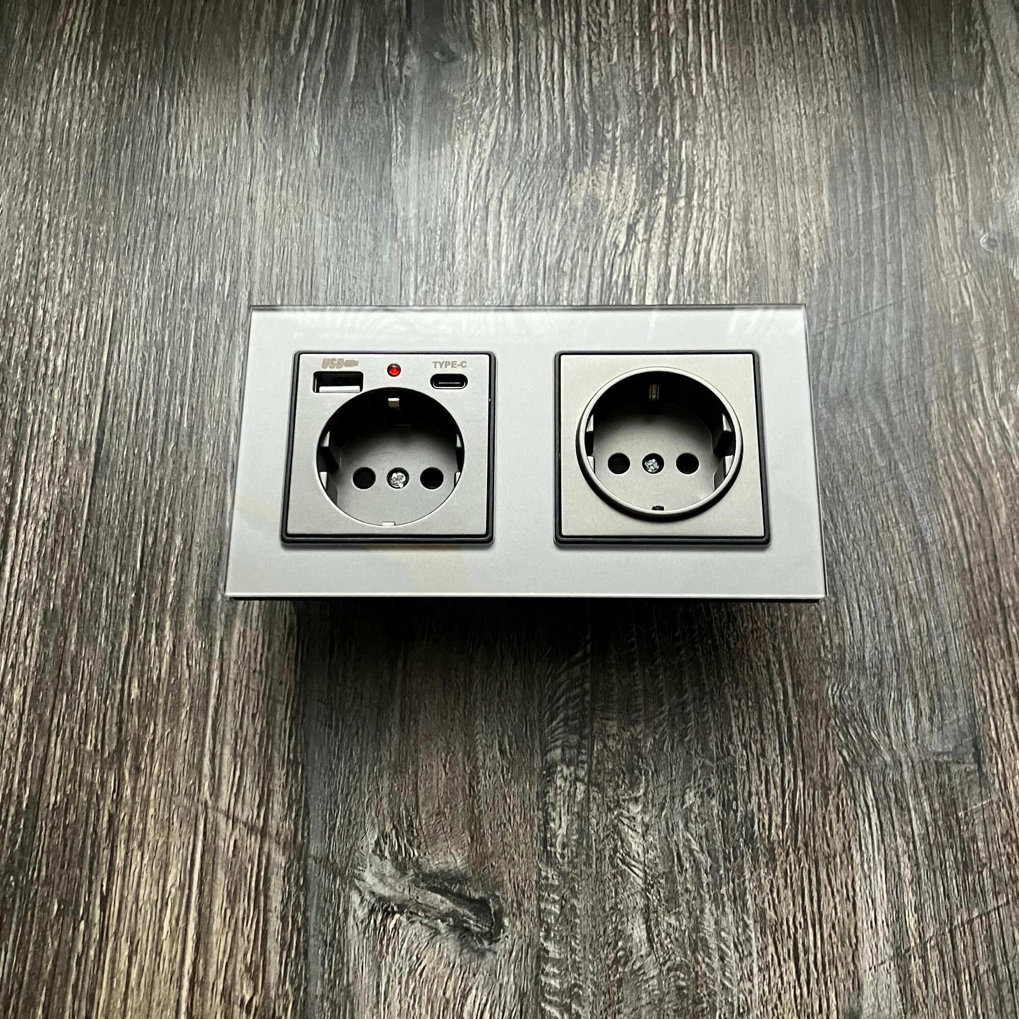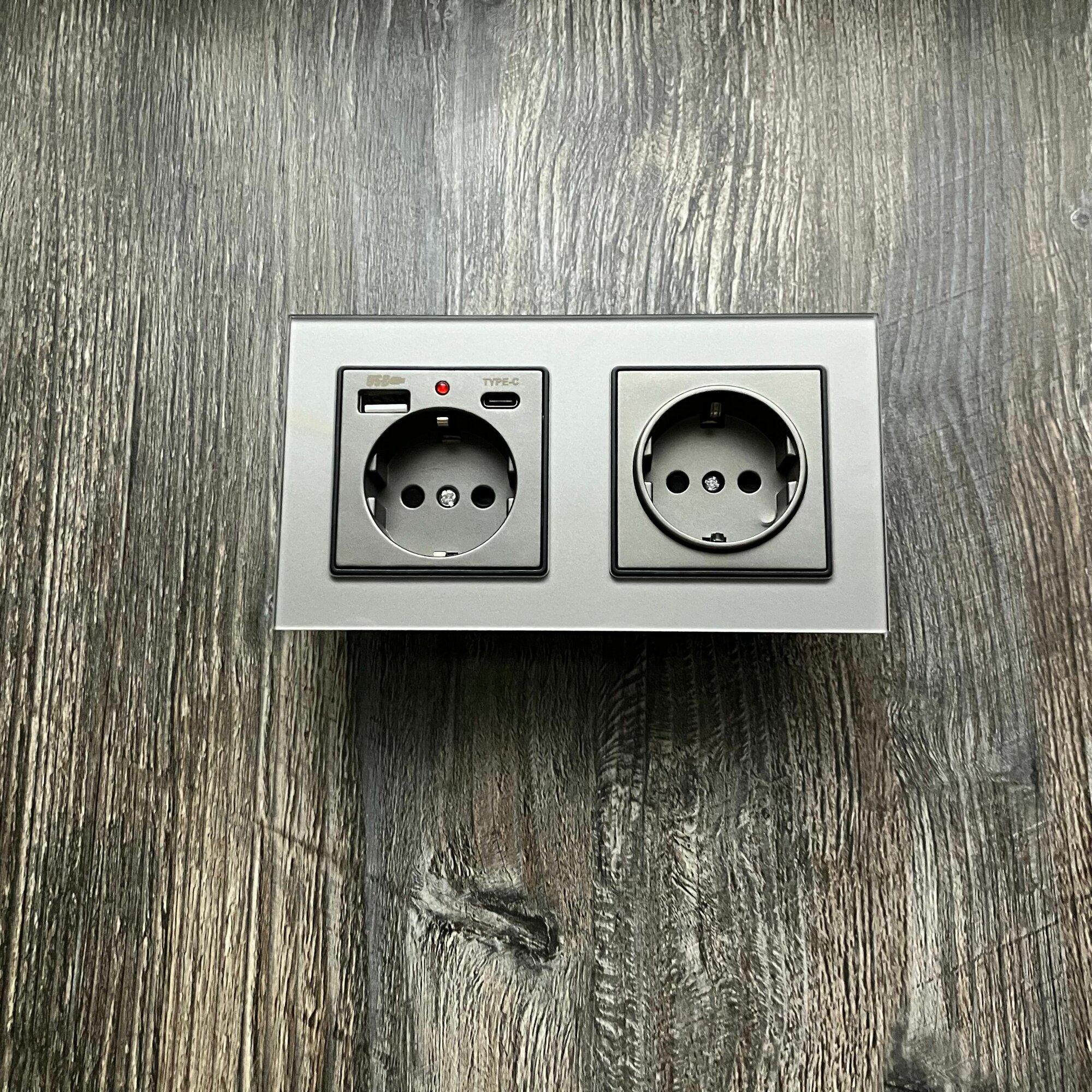Купить Розетка двойная с USB и type-C входами, 2 поста рамка закаленное стекло 153mm*82mm, цвет серый. F6