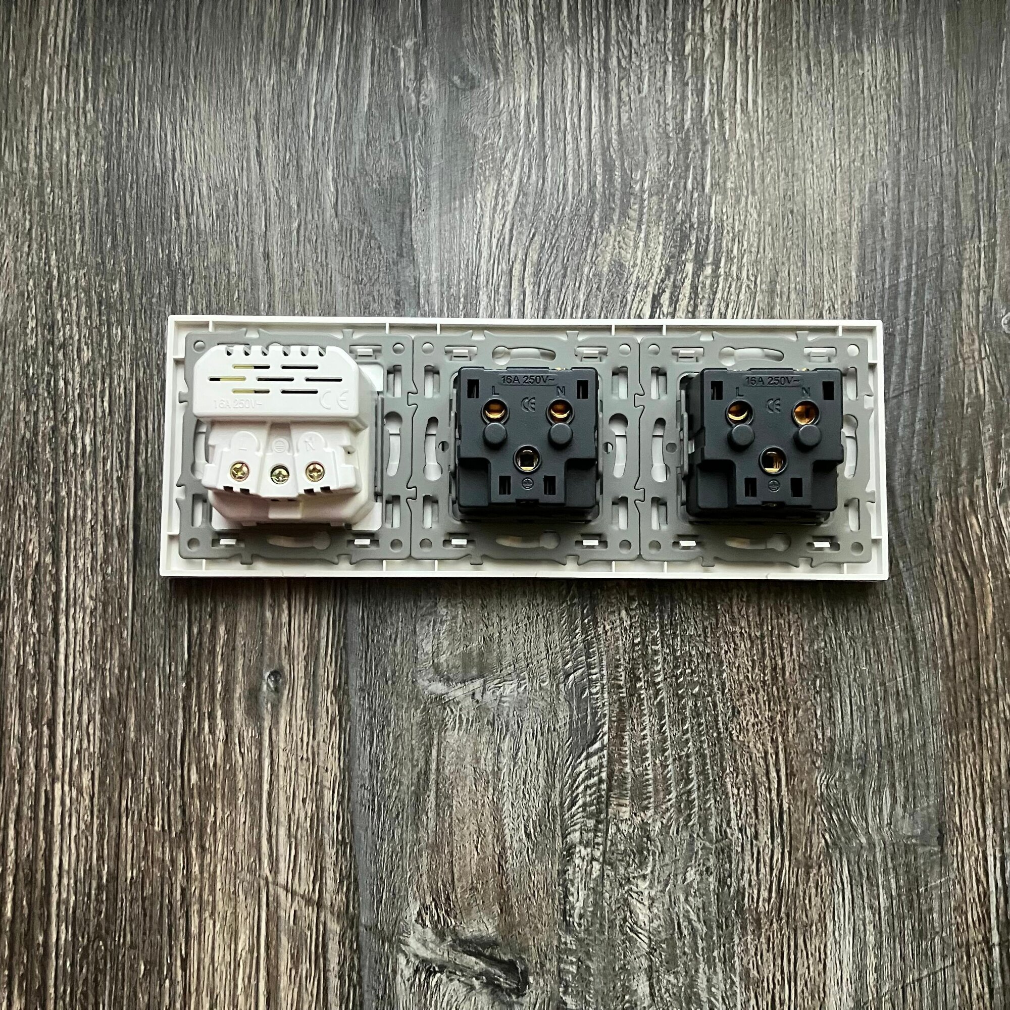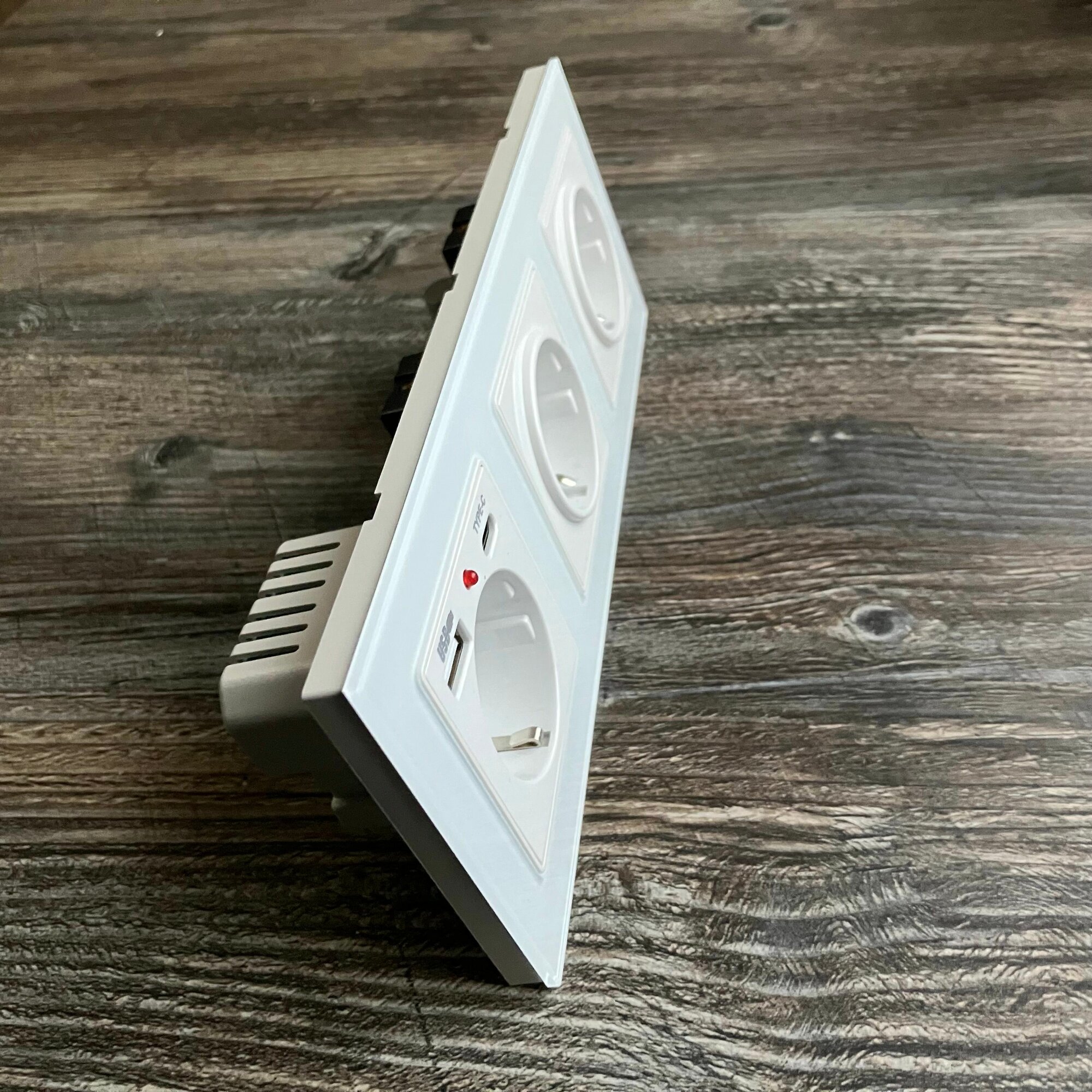 Розетка тройная с USB и type-C входами, 3 поста рамка закаленное стекло 224mm*82mm, цвет серый. F6