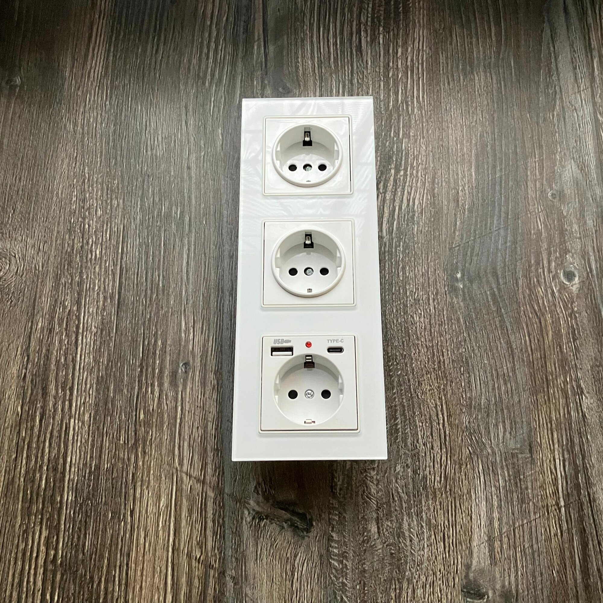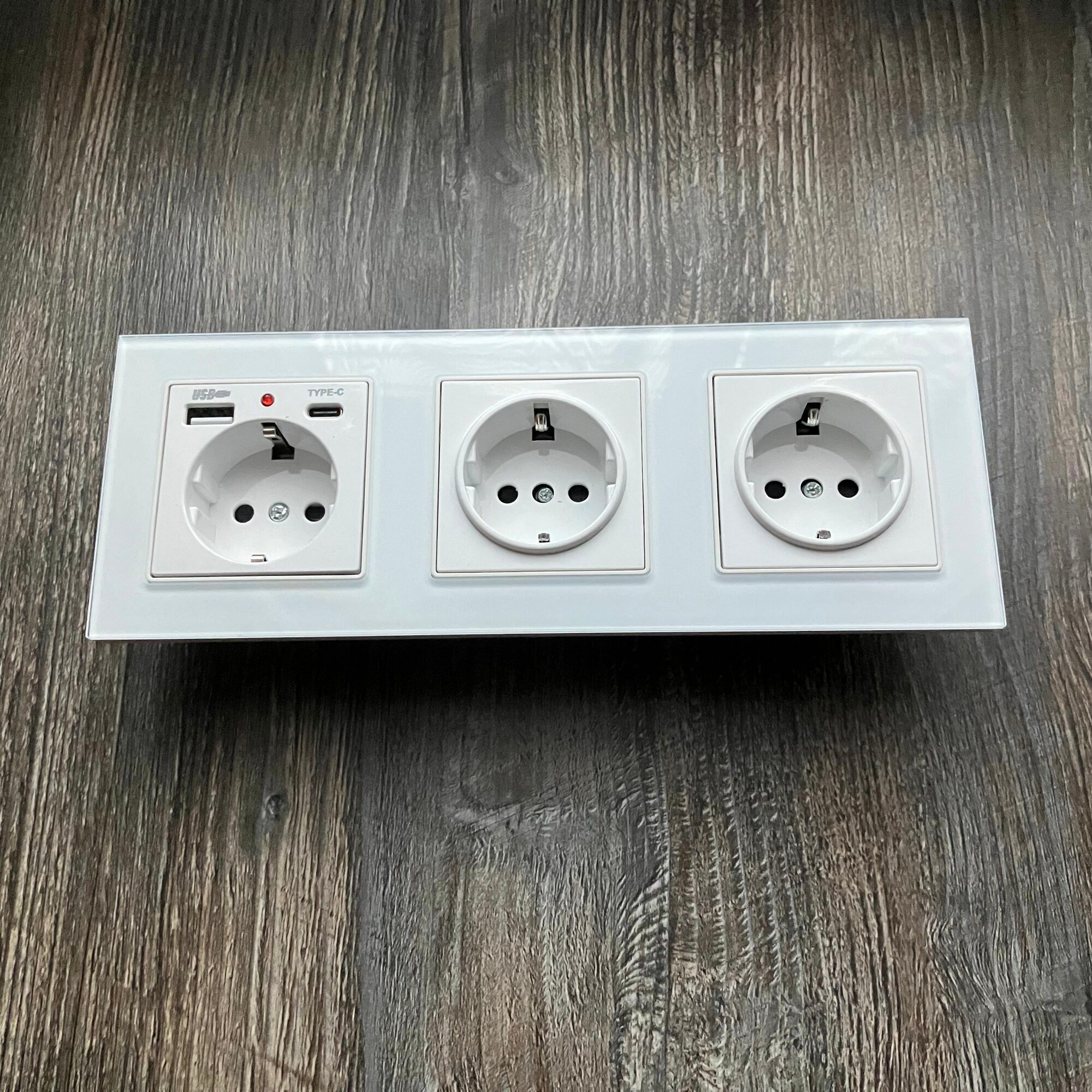 Купить Розетка тройная с USB и type-C входами, 3 поста рамка закаленное стекло 224mm*82mm, цвет белый. F6