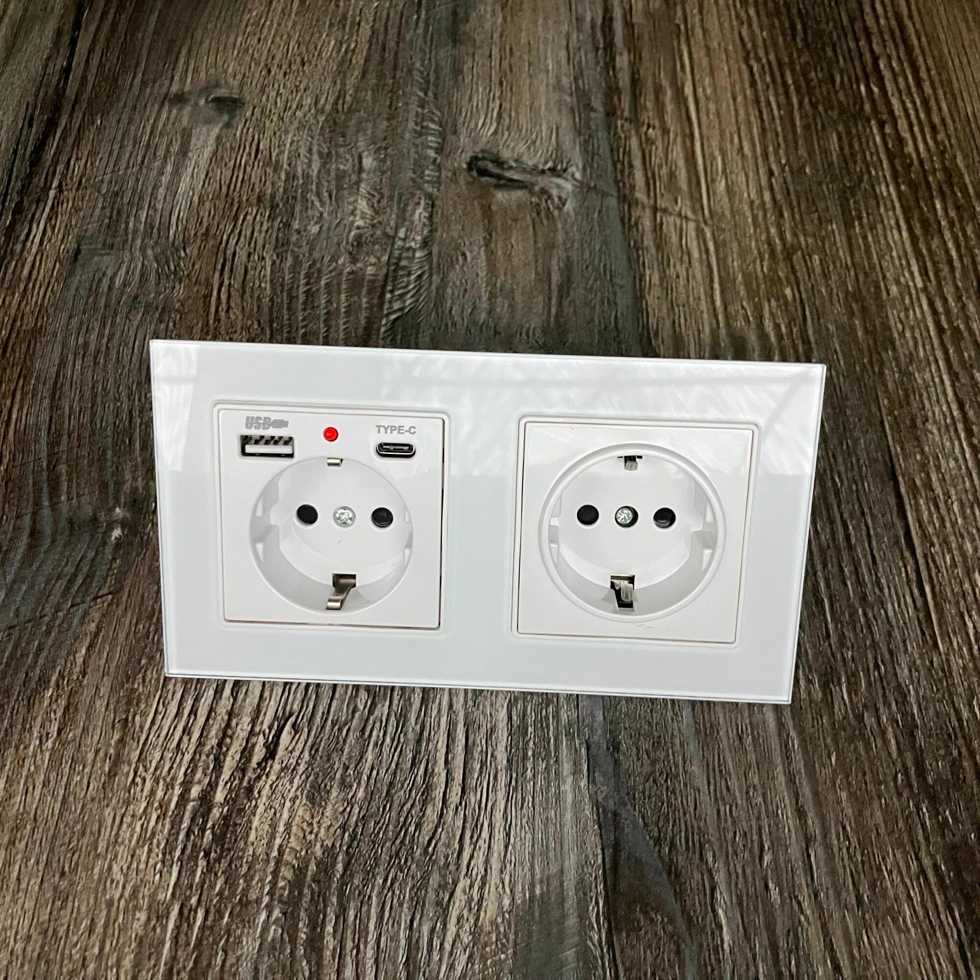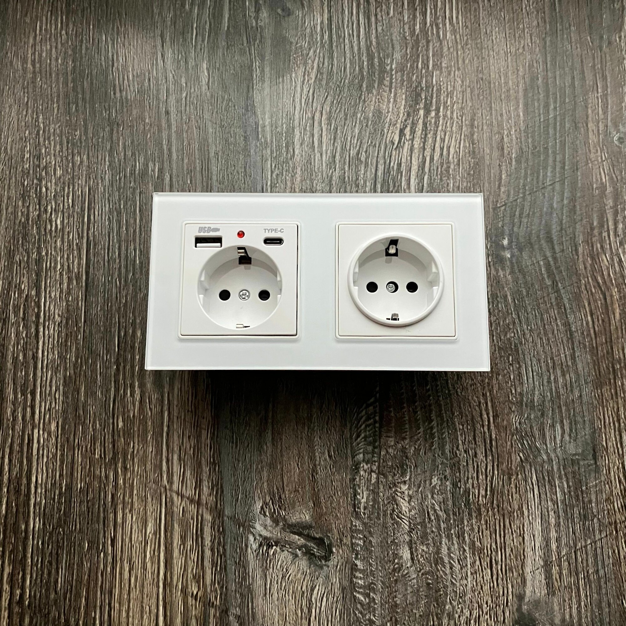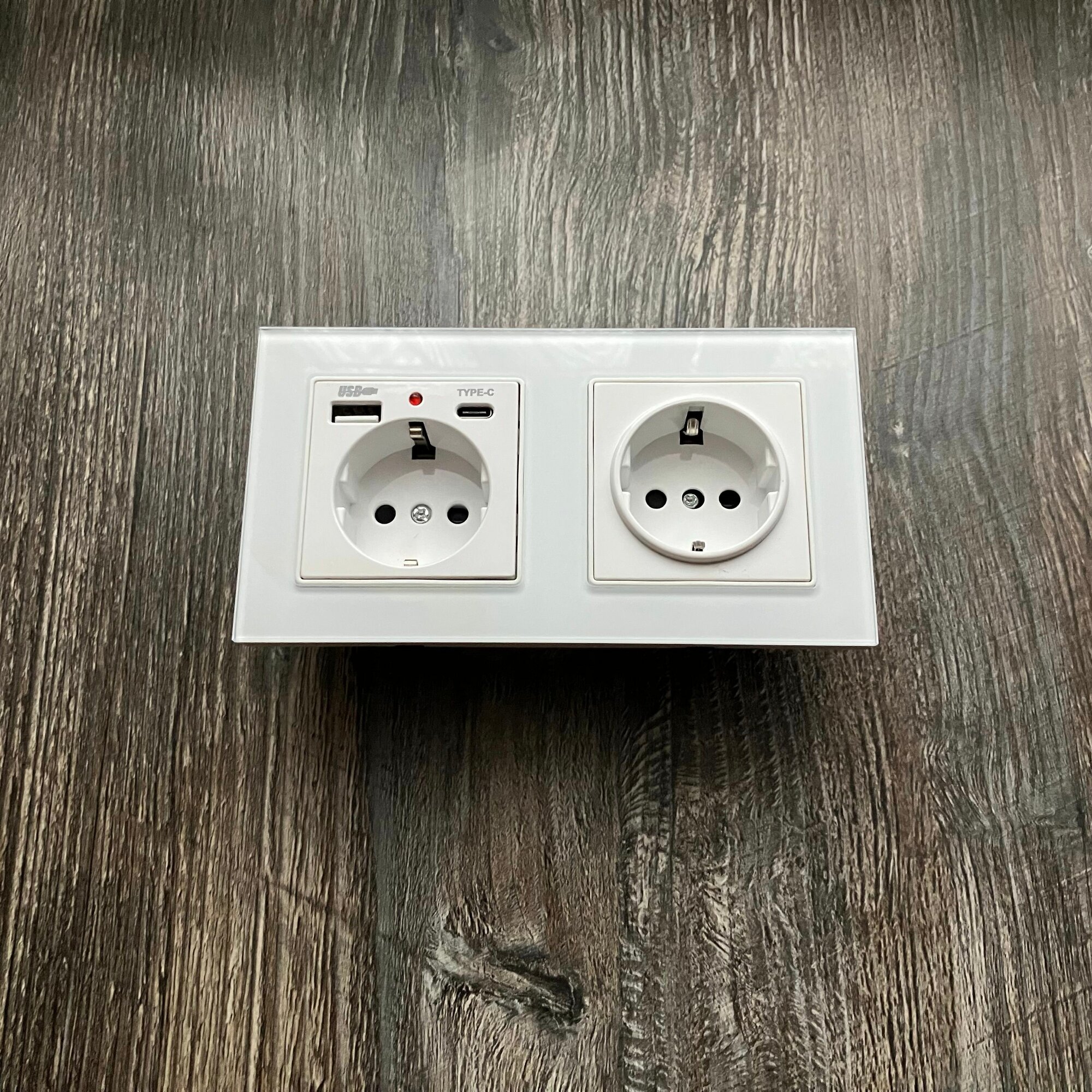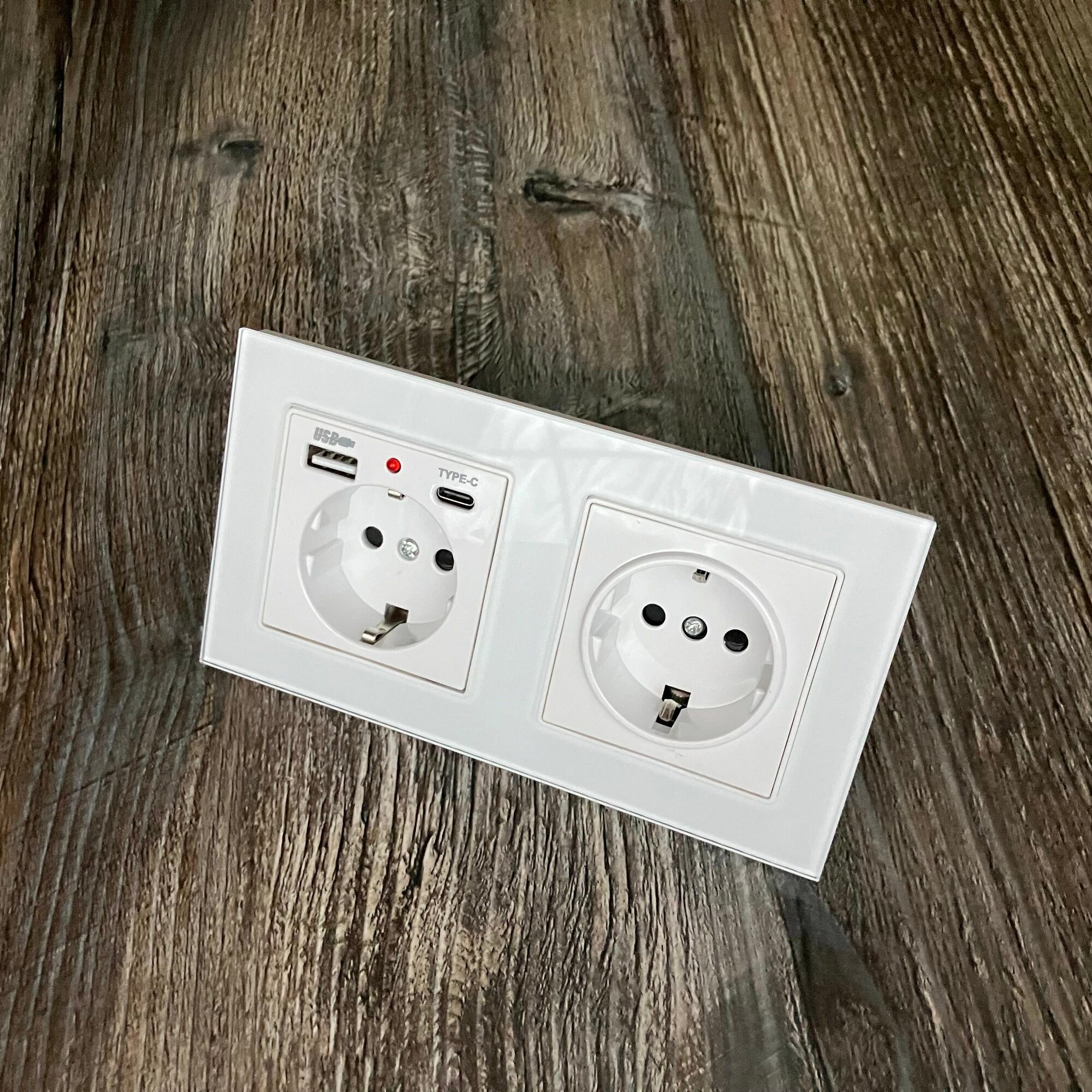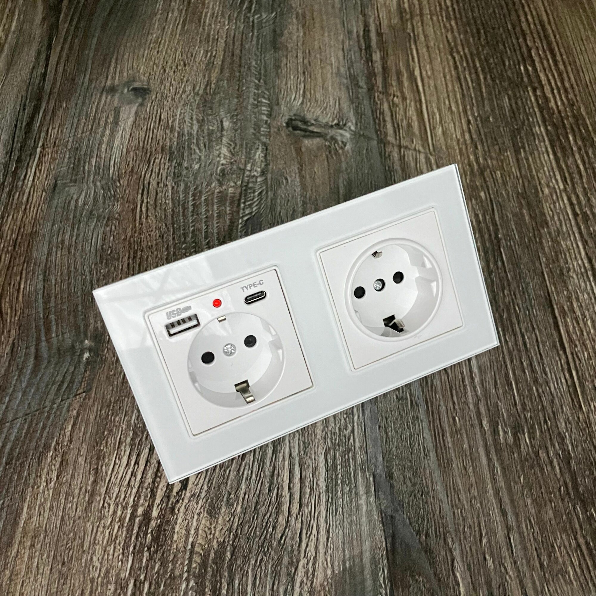 Купить Розетка двойная с USB и type-C входами, 2 поста рамка закаленное стекло 153mm*82mm, цвет белый. F6