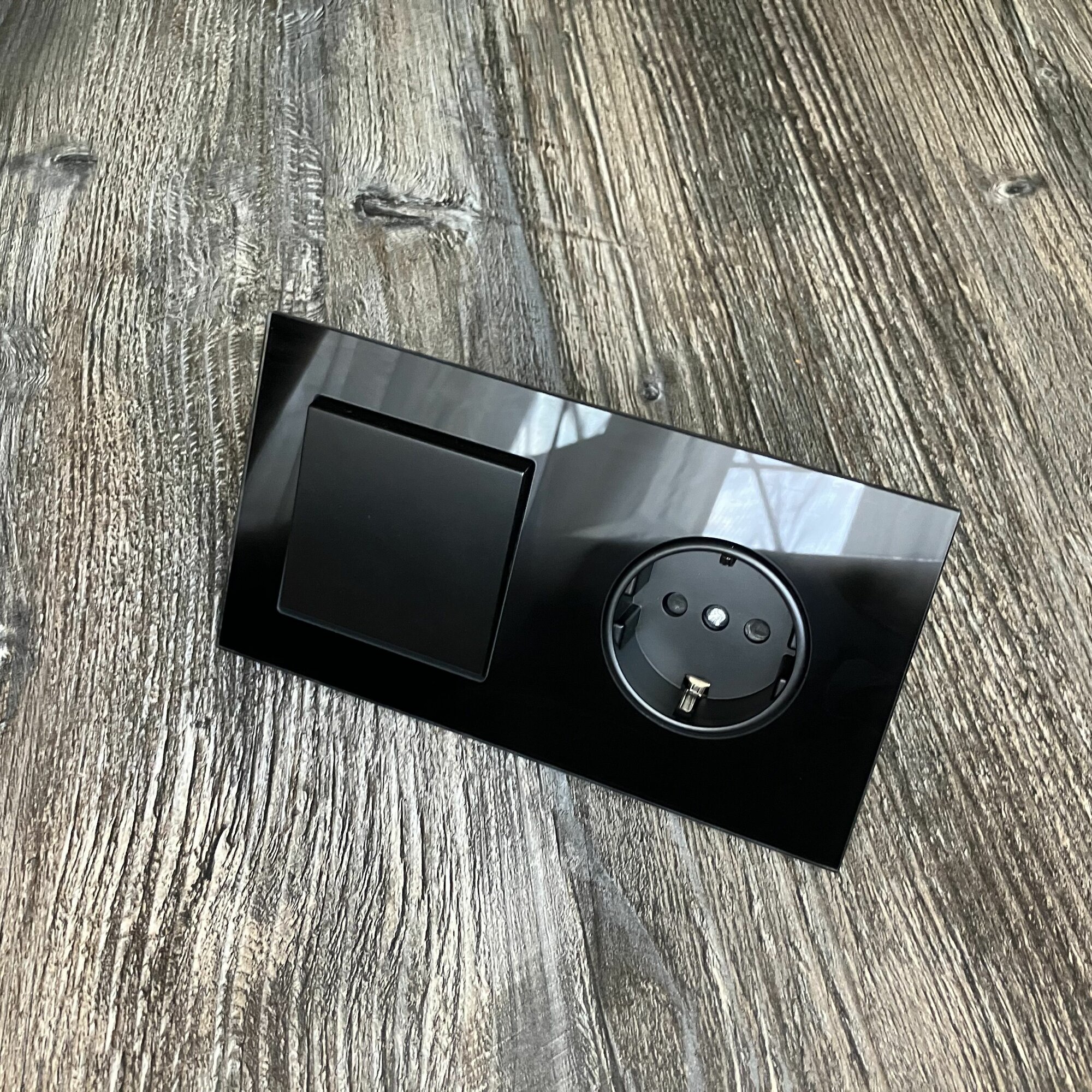 Купить Розетка с одноклавишным выключателем, рамка стекло, цвет чёрный. F8
