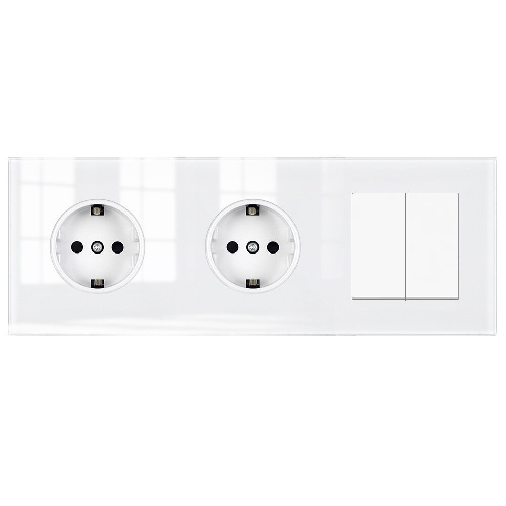 Трехклавишный выключатель с двумя розетками, 3 поста, 3 клавиша 2 розетки, рамка стекло 224*82*35mm. Белая. F8