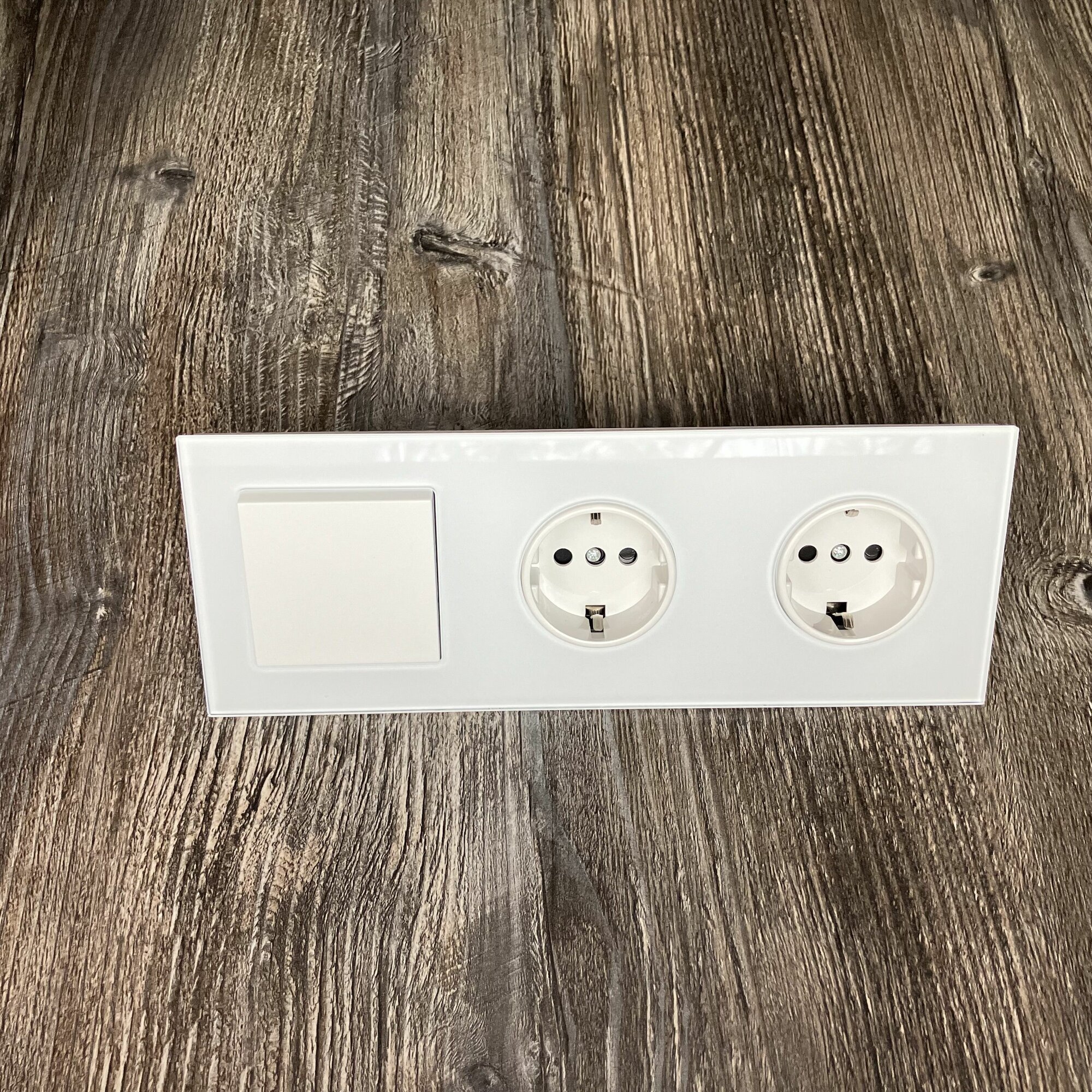 СохранитьДвойная розетка с выключателем 1-клавишный, 3 поста, рамка стекло, цвет белый. F8 интересное: