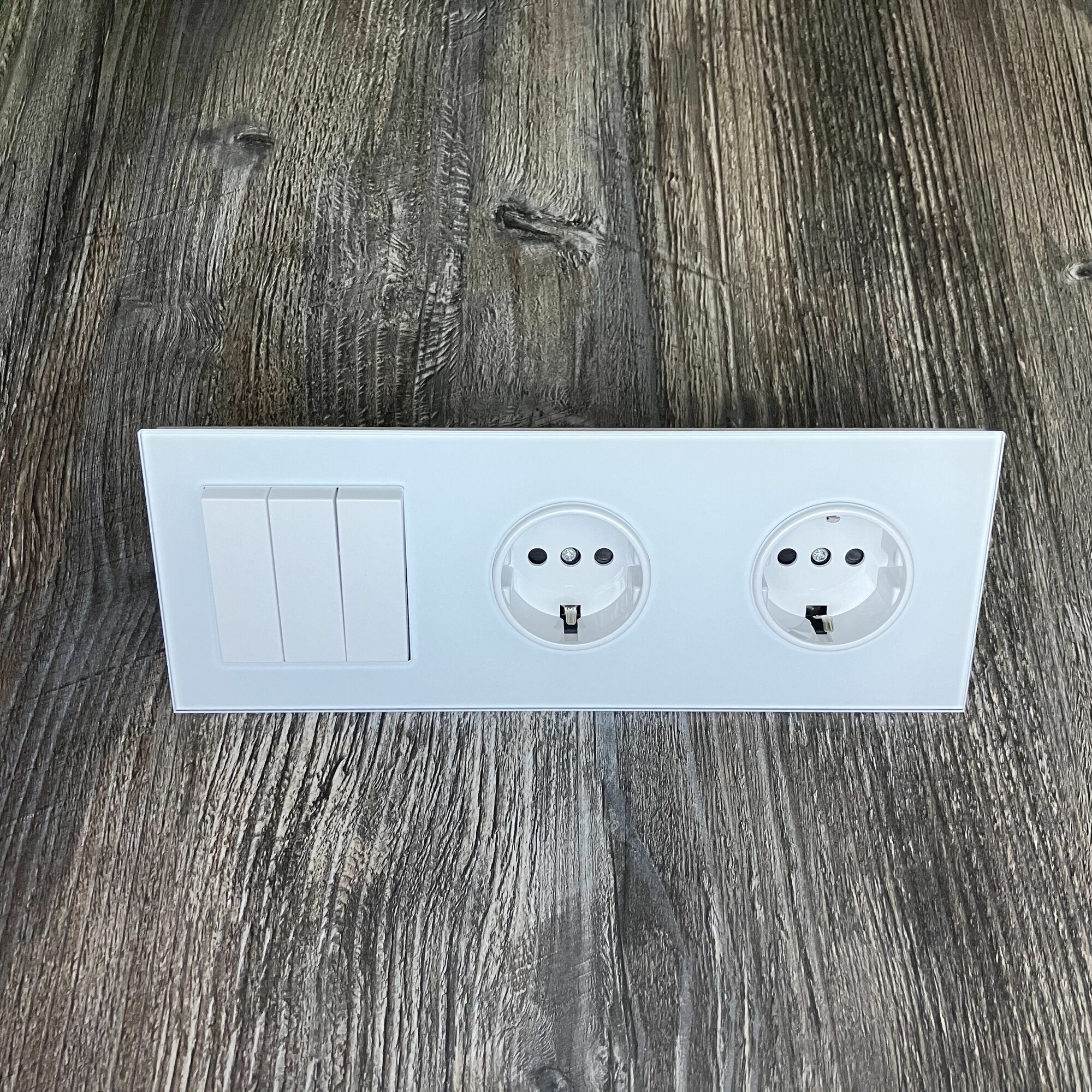 Купить Трехклавишный выключатель с двумя розетками, 3 поста, 3 клавиша 2 розетки, рамка стекло 224*82*35mm. Белая. F8