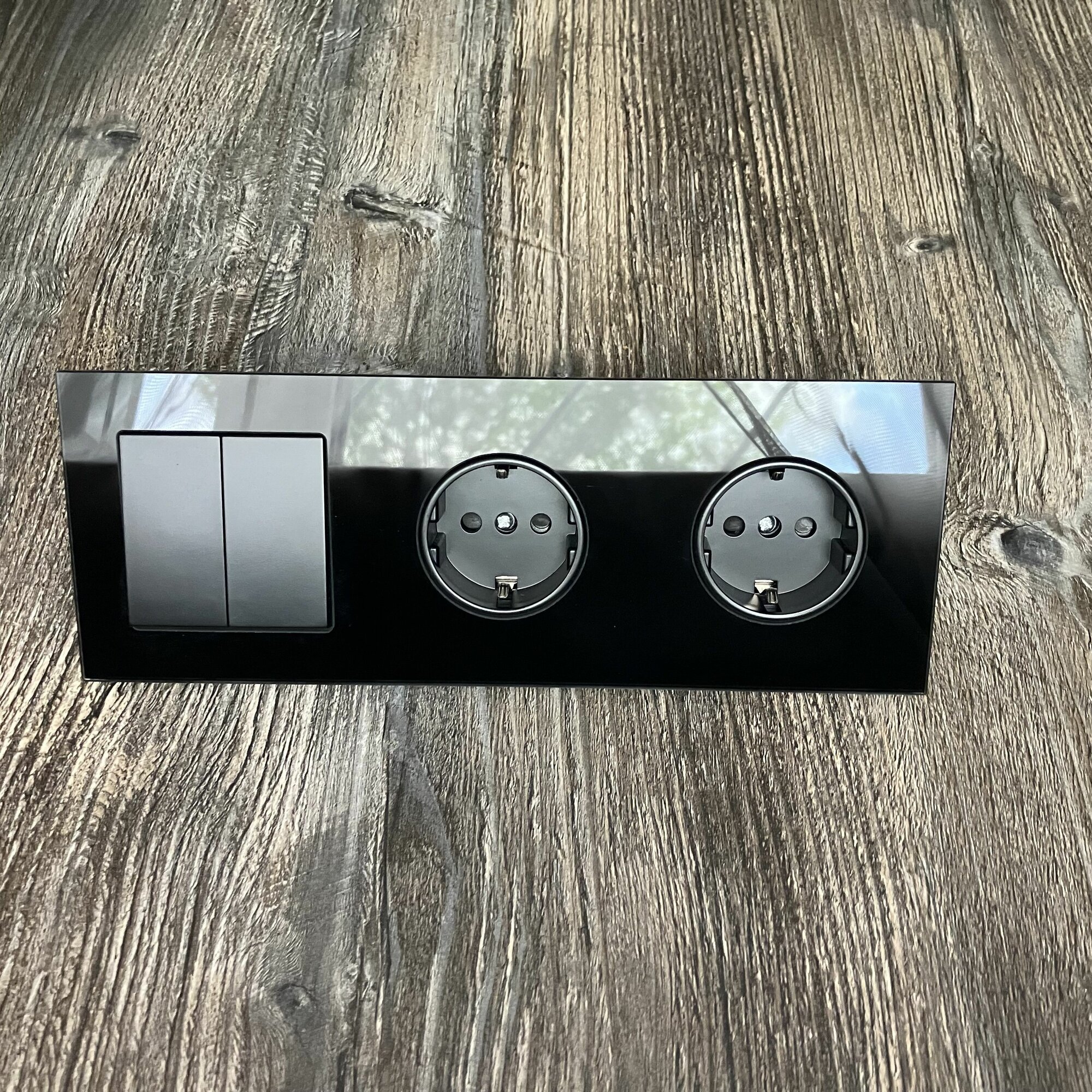 Трехклавишный выключатель с двумя розетками, 3 поста, 3 клавиша 2 розетки, рамка стекло 224*82*35mm. Чёрный. F8