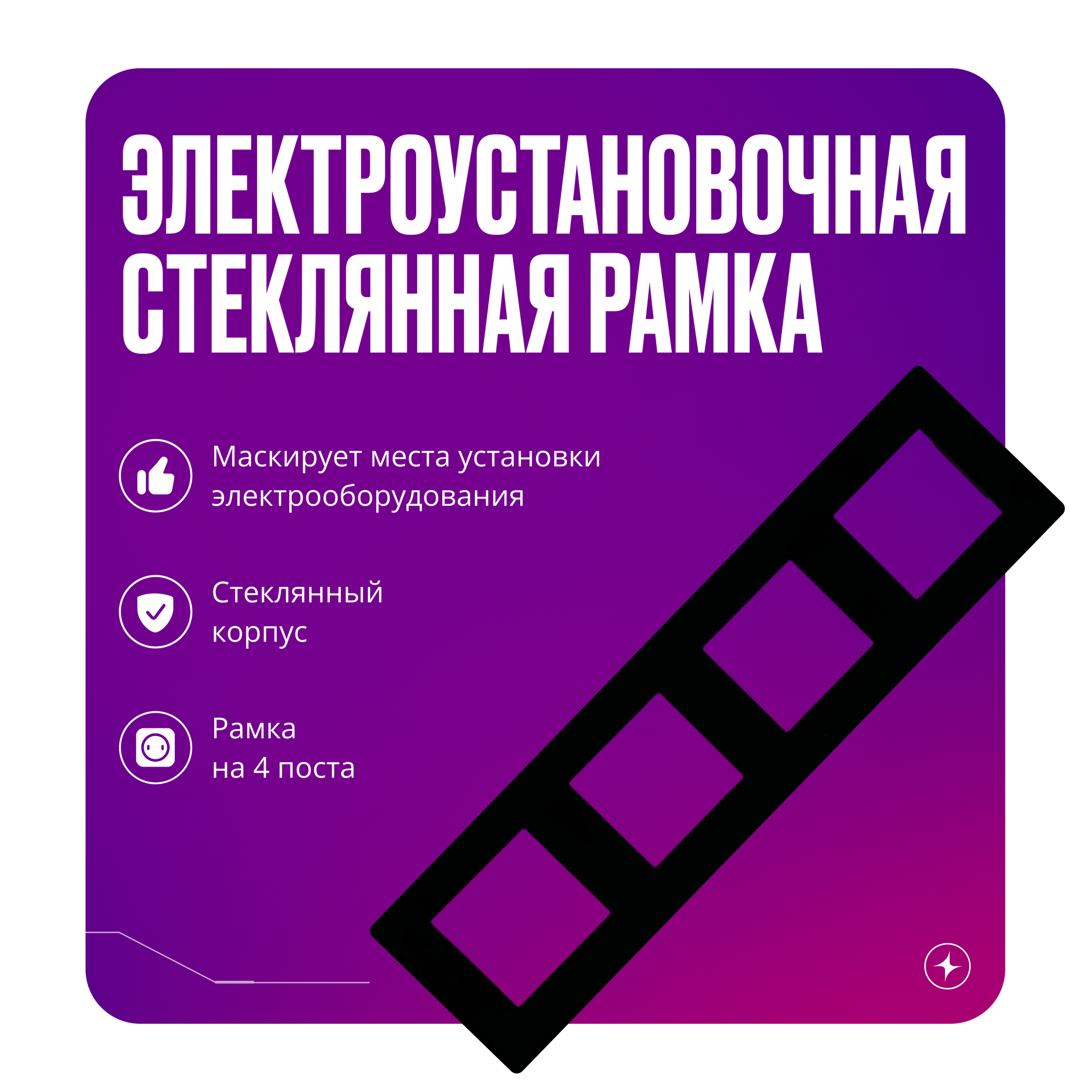 Купить Рамка для розетки/выключателя электроустановочная на 4 поста, черная, стеклянная, квадратная, с металлическим брекетом