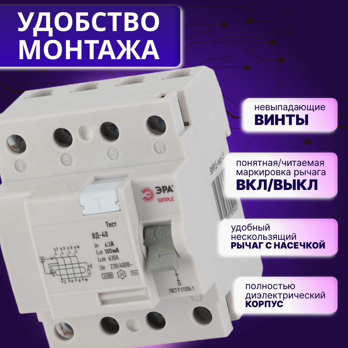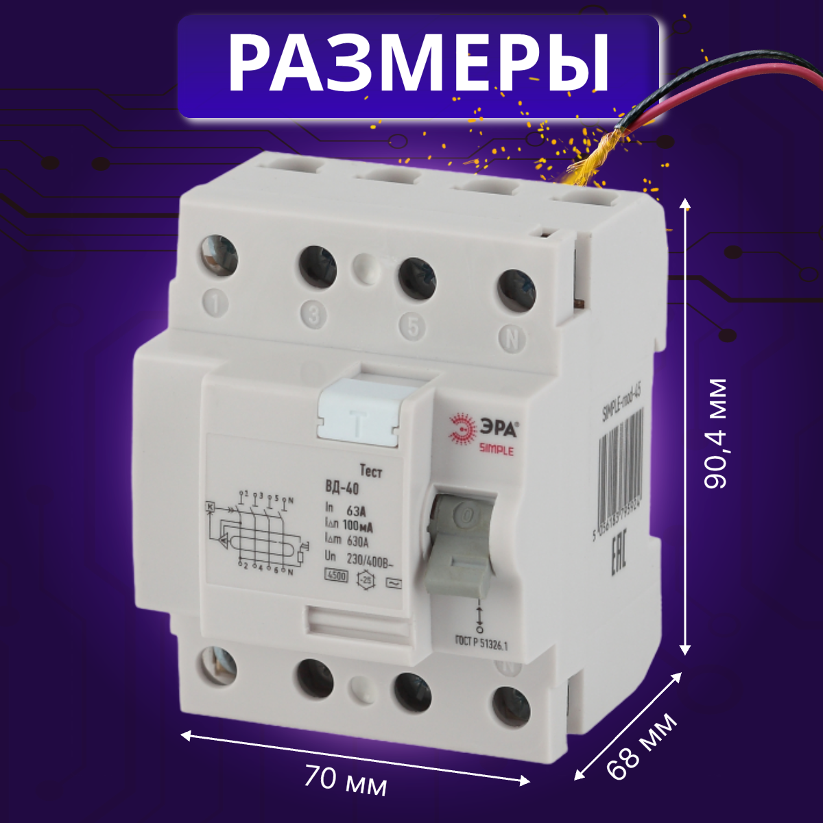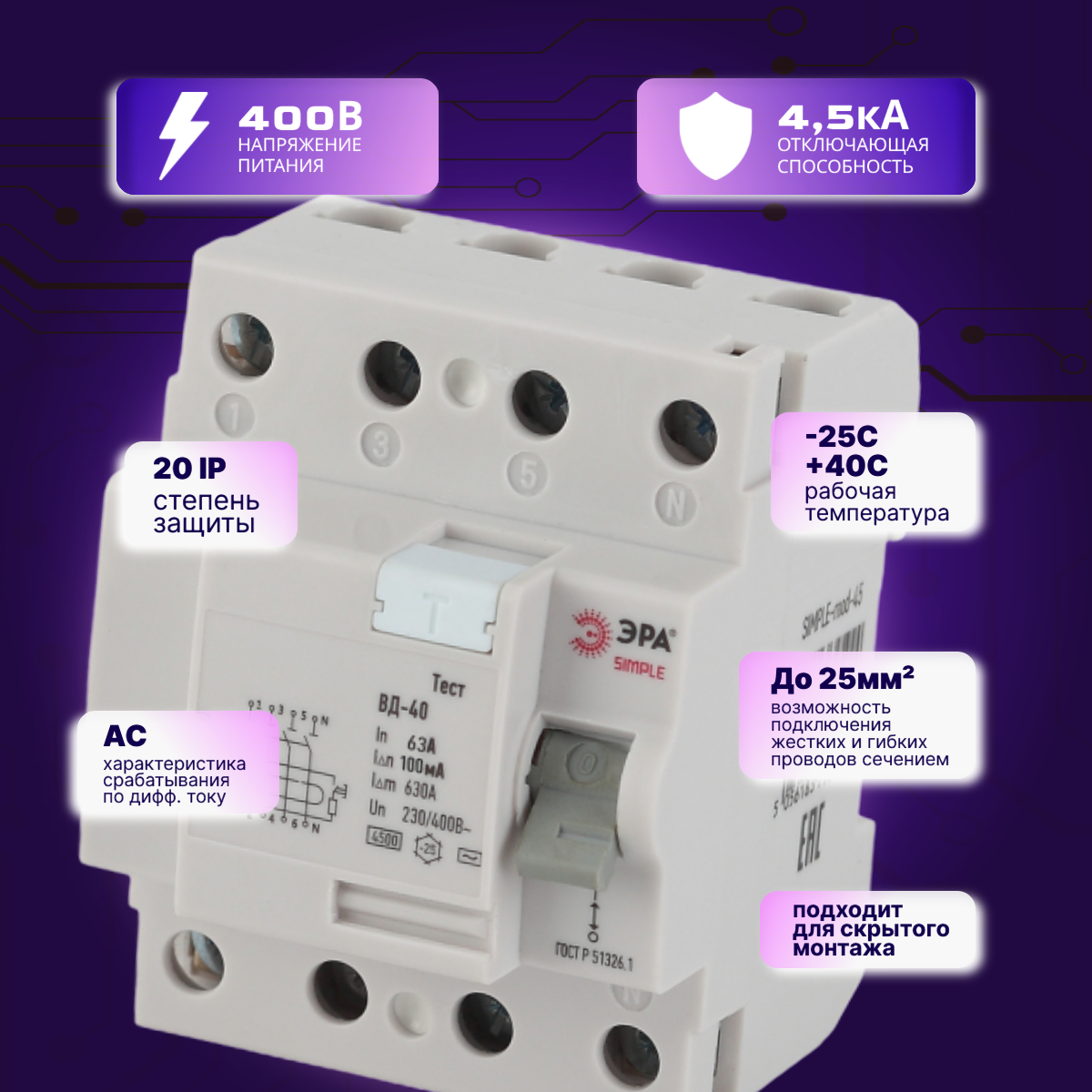 Выключатель диф тока УЗО 4P (4П) 63А 100 мА АС электронное SIMPLE-mod-50 ВД-40 Б0039270 Эра 1шт интересное: