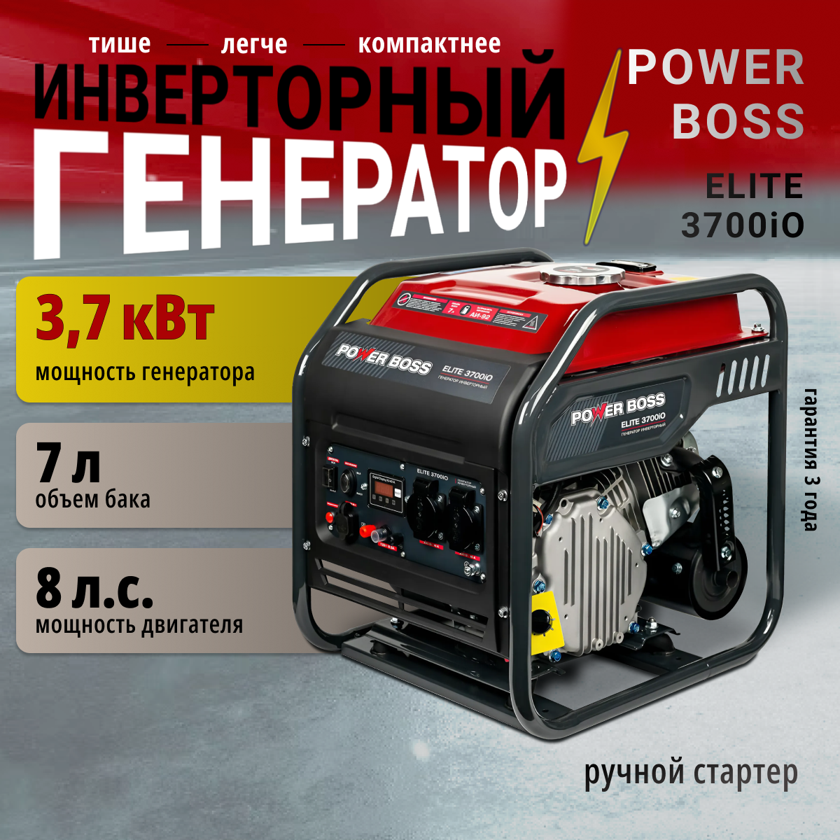 Купить Генератор инверторный Power Boss ELITE 3700iO, 3.7 кВт 223 см3, 7л объем топливного бака, розетки 2х230 В/16 А, USB 5В