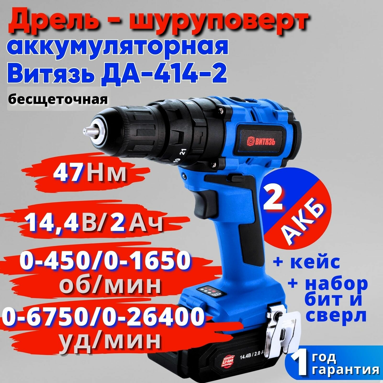 Купить Дрель-шуруповерт аккумуляторная Витязь ДА-414-2 / бесщеточная (14.4 В, 47 Нм, 2 АКБ, кейс, набор бит и сверл)