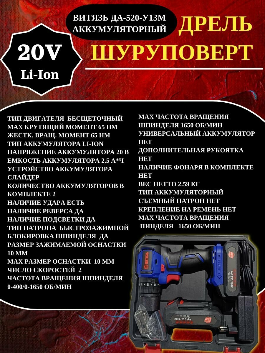 Дрель шуроповерт Витязь ДА-520-13, бесщеточный, 20В, 65Нм, LiIon, 2ач, 2шт, быстрозажимной патрон