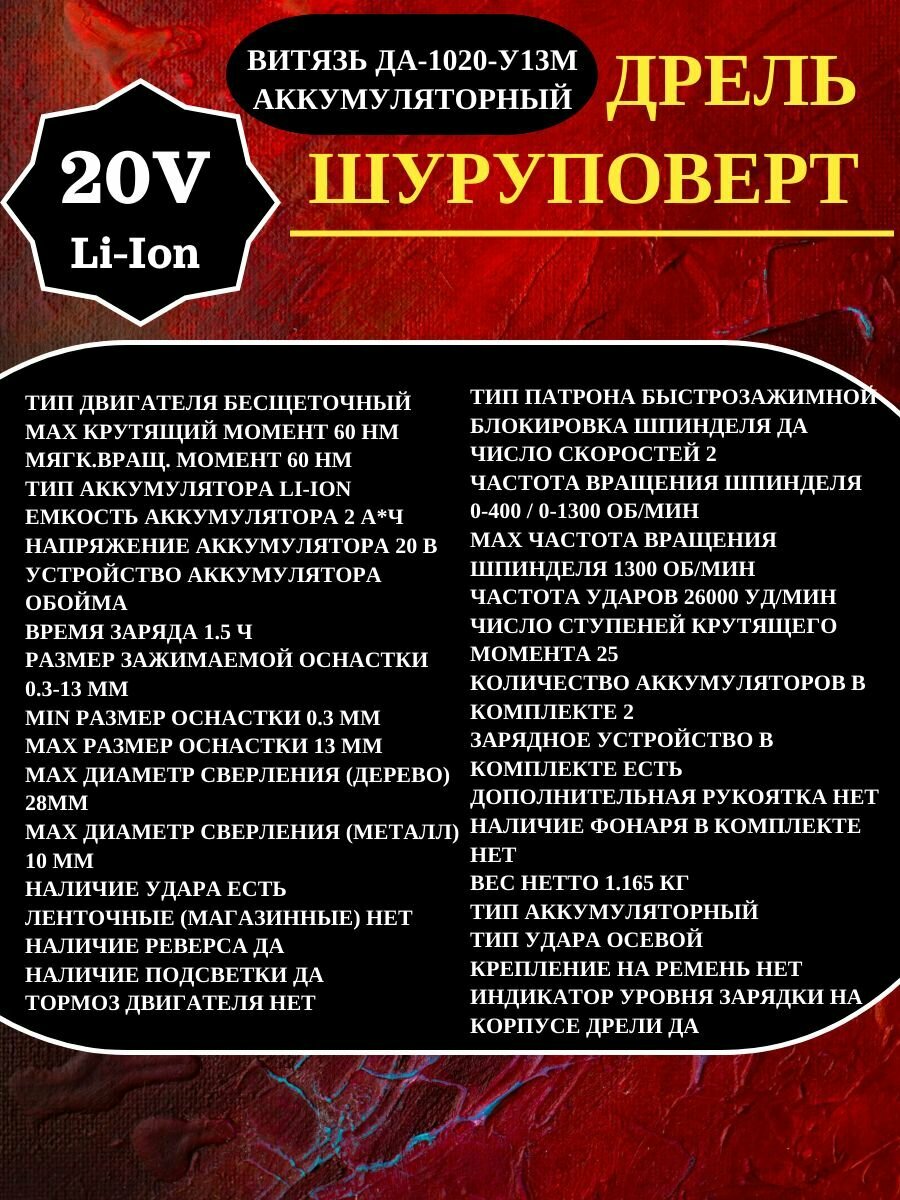 Дрель шуроповерт Витязь ДА-520-13, бесщеточный, 20В, 65Нм, LiIon, 2ач, 2шт, быстрозажимной патрон
