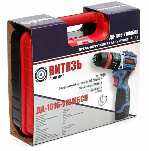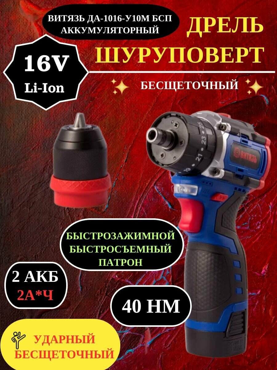 Дрель шуруповерт с быстрозажимным патроном Витязь ДА-1016-У10М, 16В, LiIon, в кейсе, 2 акк, 2 скор, подсветка