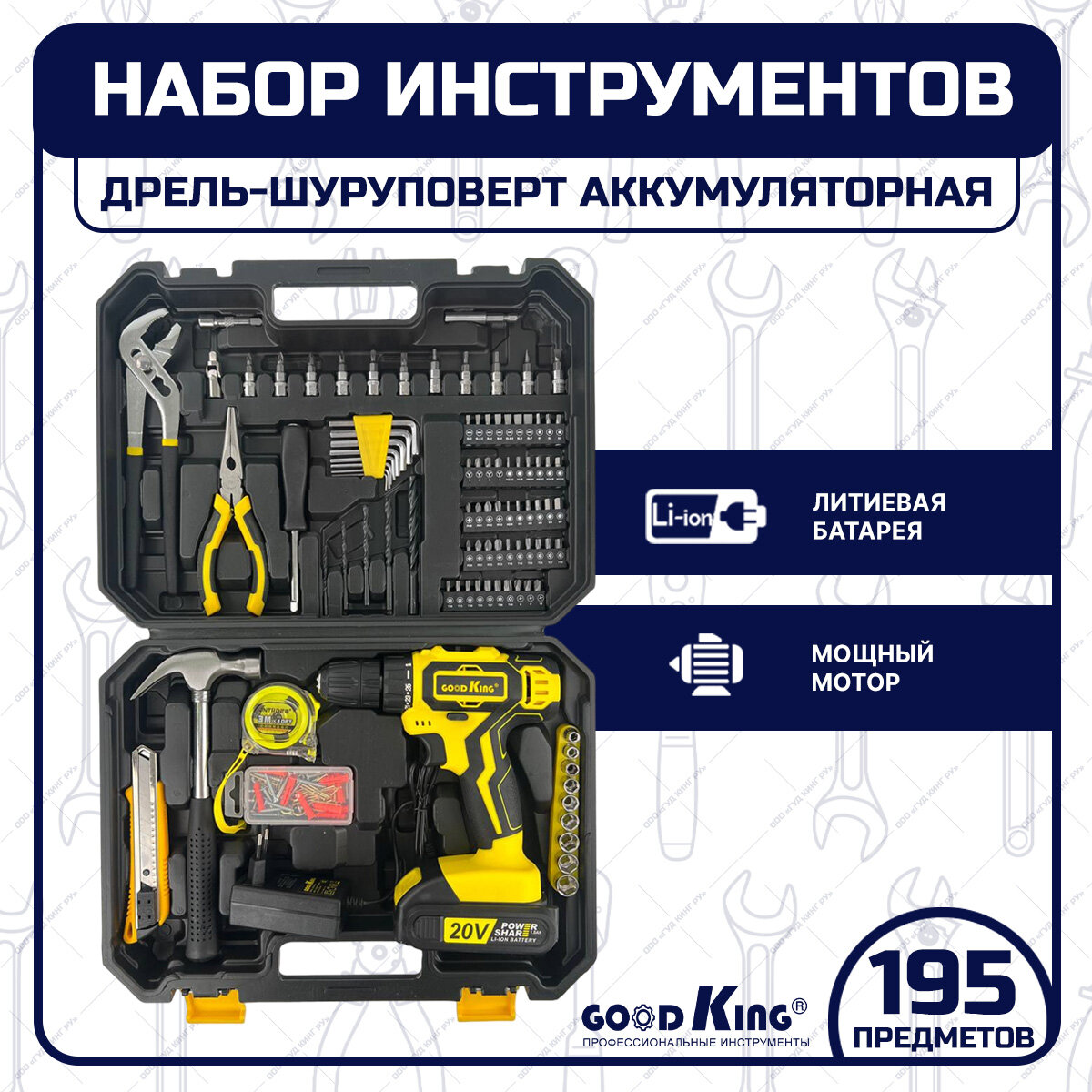 Купить Шуруповерт аккумуляторный GOODKING EC-2001195 195 предметов, набор инструментов, 2 АКБ, Li-ion, 20 В, 30 Нм, 1.5 Ач