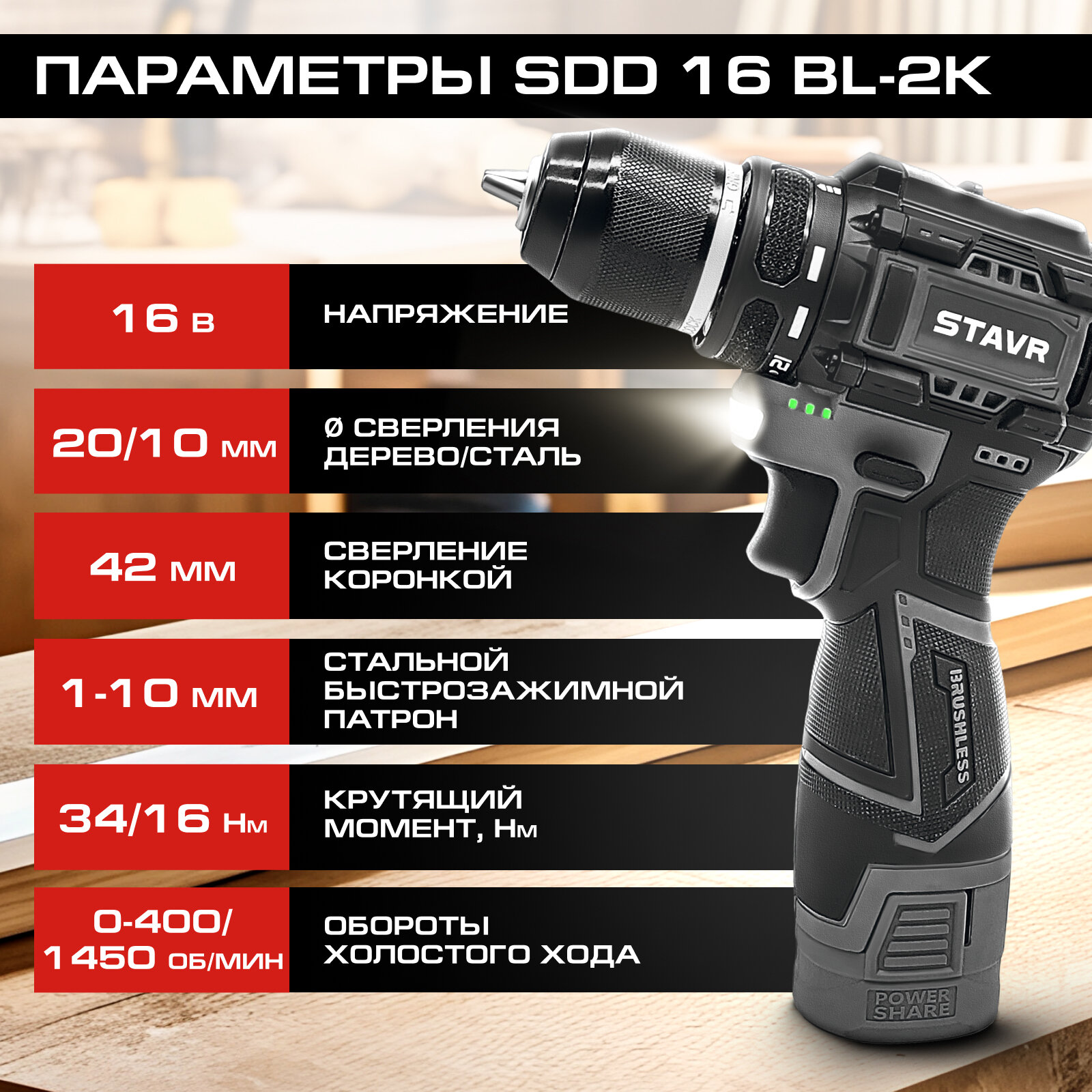 Дрель-шуроповерт STAVR SDD 16BL-2K, 16В, Li-Ion, 2Ач, 34Нм, 1450об/мин интересное: