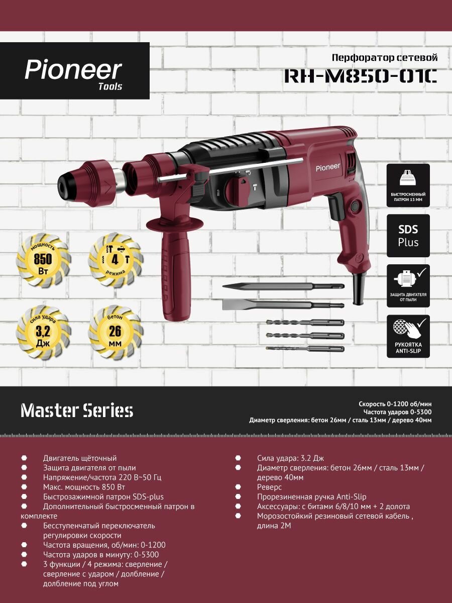 Перфоратор электрический ударный Pioneer RH-M850-01C / 850 Вт, SDS-plus, 3,2 Дж, 1200 об/мин, 5300 уд/мин интересное:
