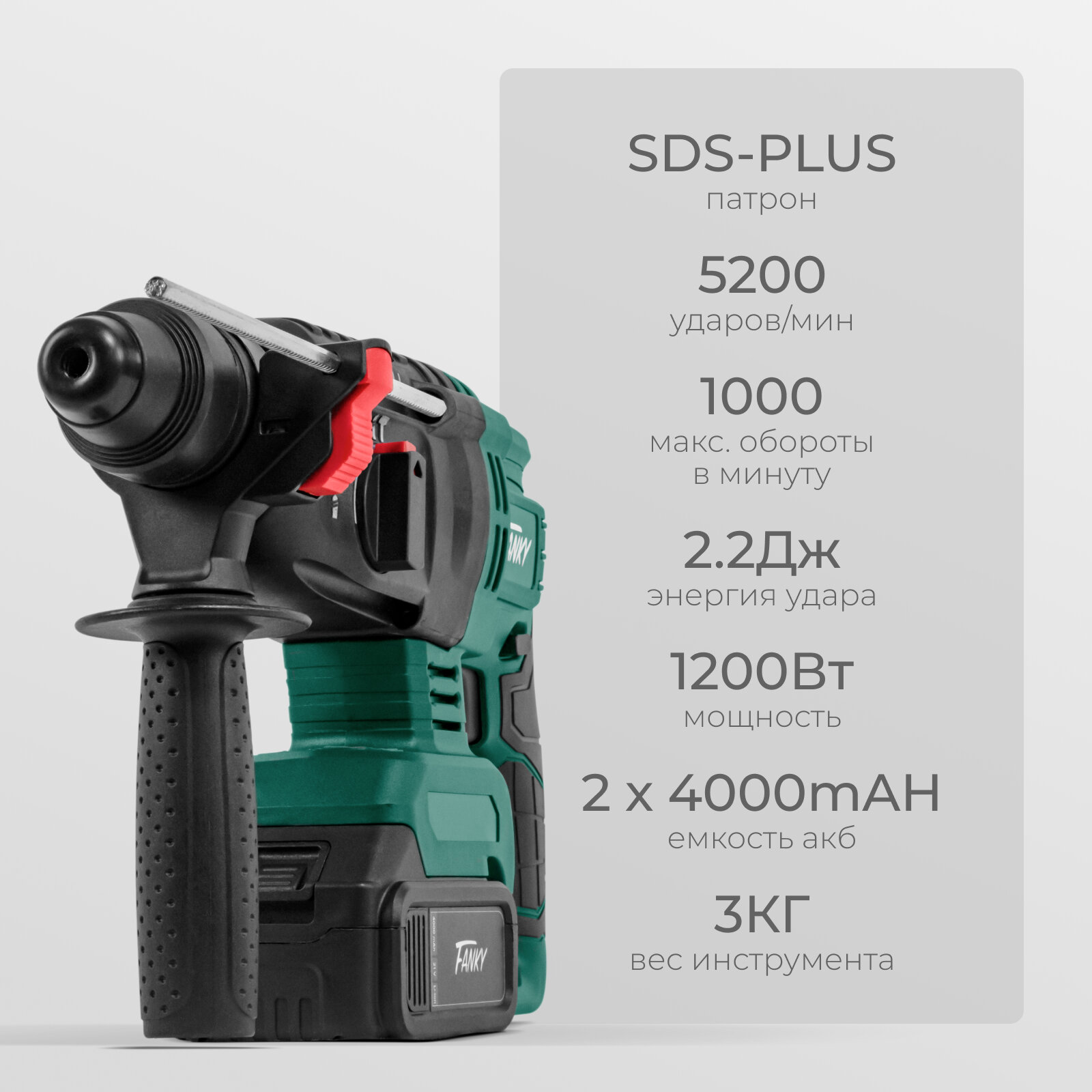 Купить Перфоратор аккумуляторный Fanky бесщеточный 2 АКБ в кейсе, профессиональный с режимом долбления, SDS - plus, зеленый