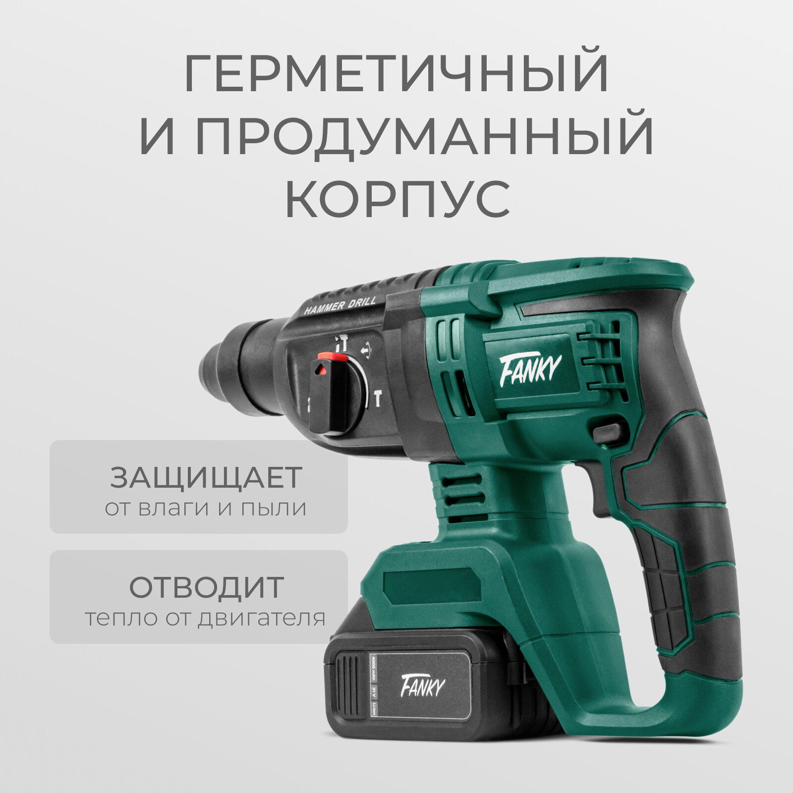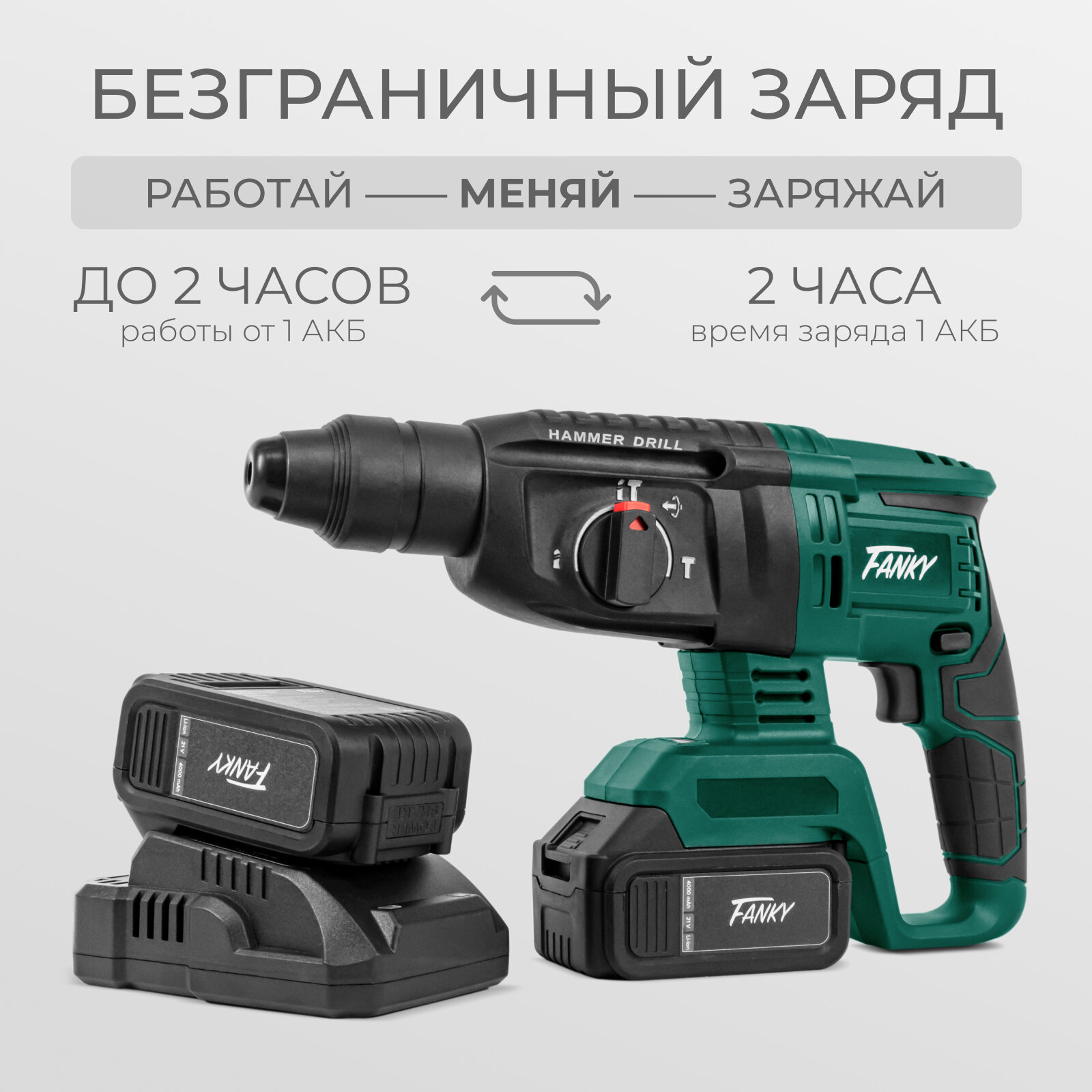 Перфоратор аккумуляторный Fanky бесщеточный 2 АКБ в кейсе, профессиональный с режимом долбления, SDS - plus, зеленый интересное: