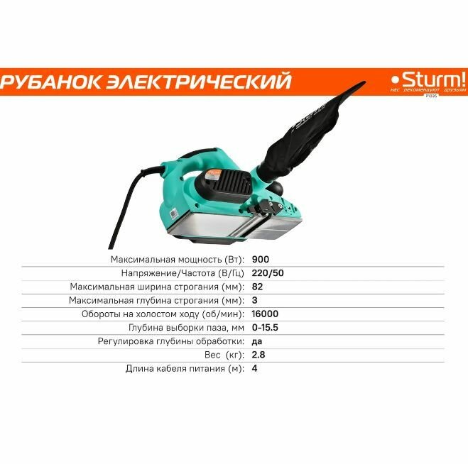 Рубанок Sturm! P1095 (900Вт, 82мм, глубина 3мм, выборка паза -15.5мм, кабель 4м) интересное: