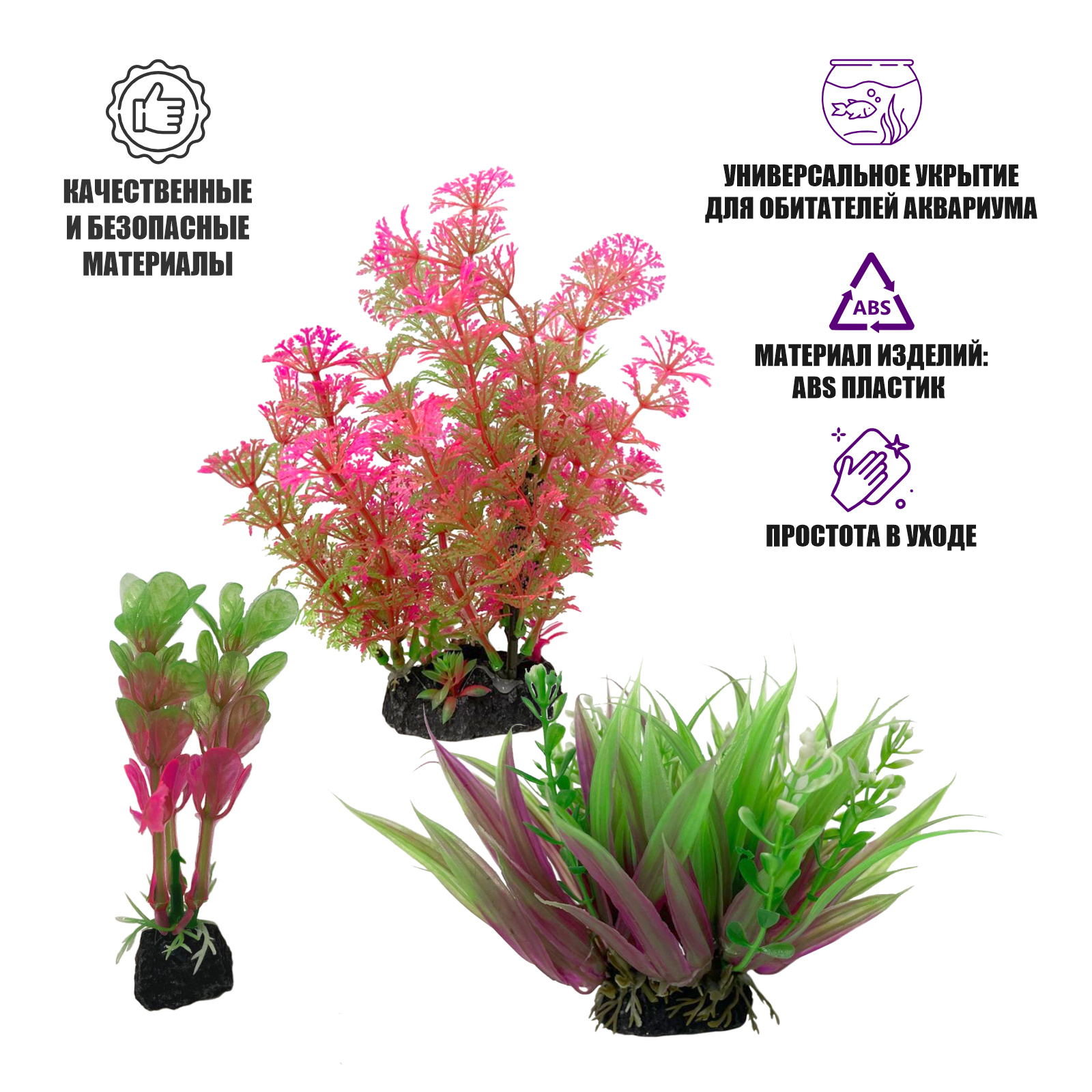 Купить Декор для аквариума, растения искусственные, Амбулия розово-зеленая, Рео покрывальчатое и Альтернантера розовая