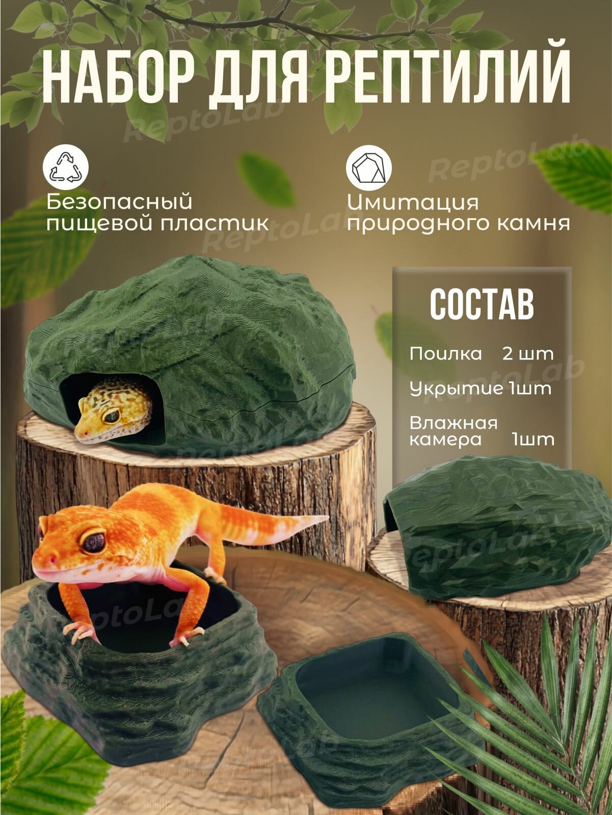 Набор для рептилий: влажная камера, укрытие, поилки для гекконов и эублефаров. Цвет : Зеленый. интересное: